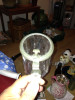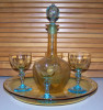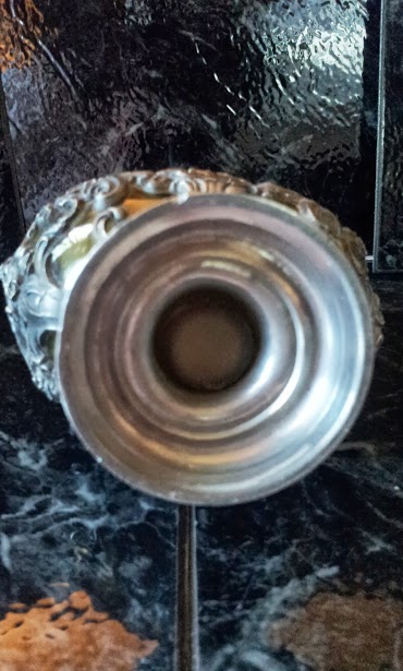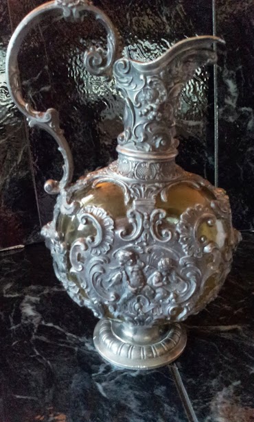 Almost like a small pitcher, hand blown amber glass surrounded by pewter decorated with cherubs in different poses and scenes intricate carvings no visible makersmarks found only one similar on ebay but it is gone now. That description stated it had characteristics of WMF but again no markings.
