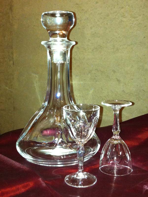 Beautifully shaped 10" decanter and stopper with 4" stemmed shot glasses (2).