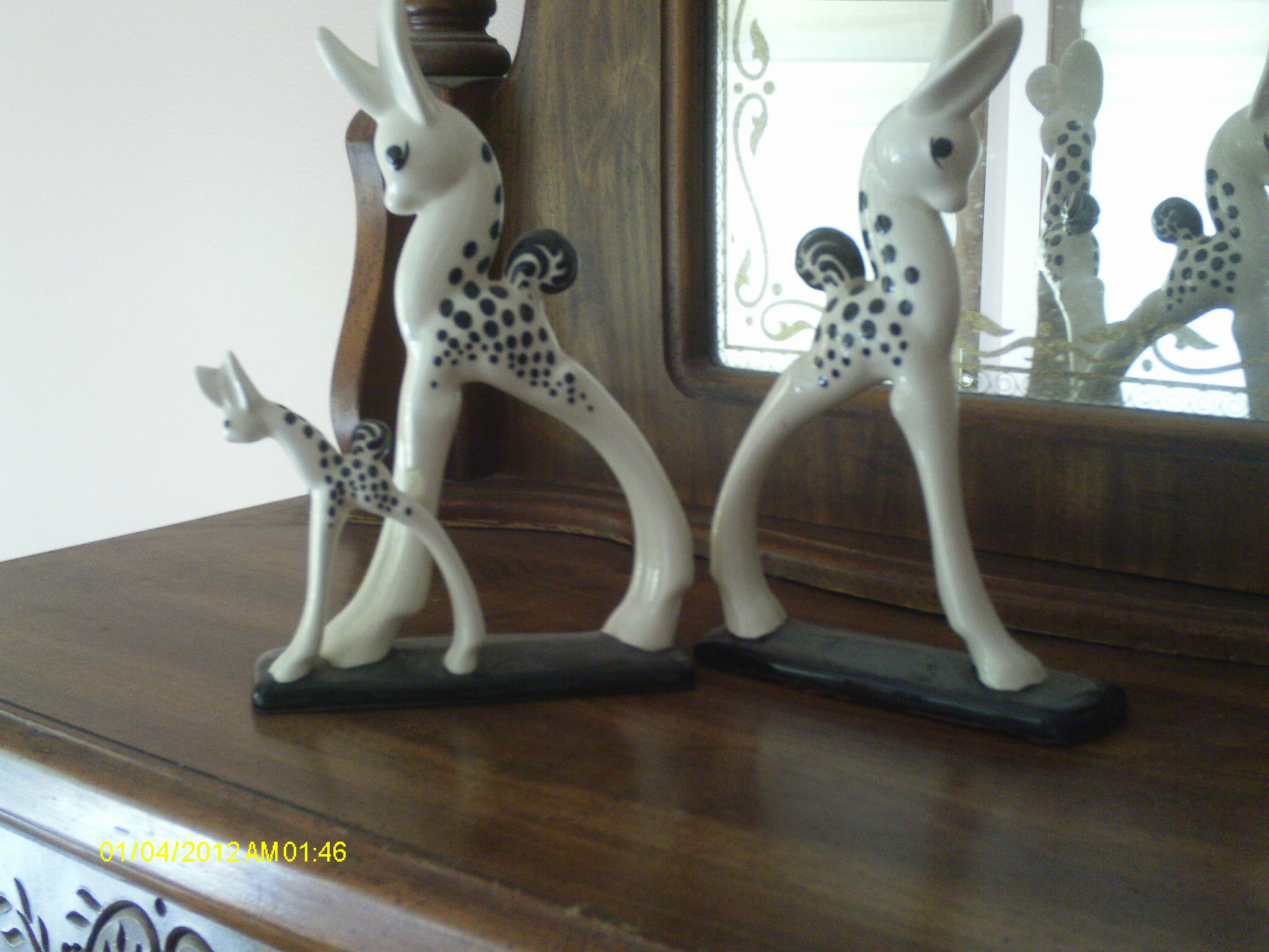 deco style pair of ceramic giraffe figurines about 12 inches tall, 7 inches wide. white with black details. shiny glaze. one mother with baby one father
