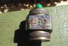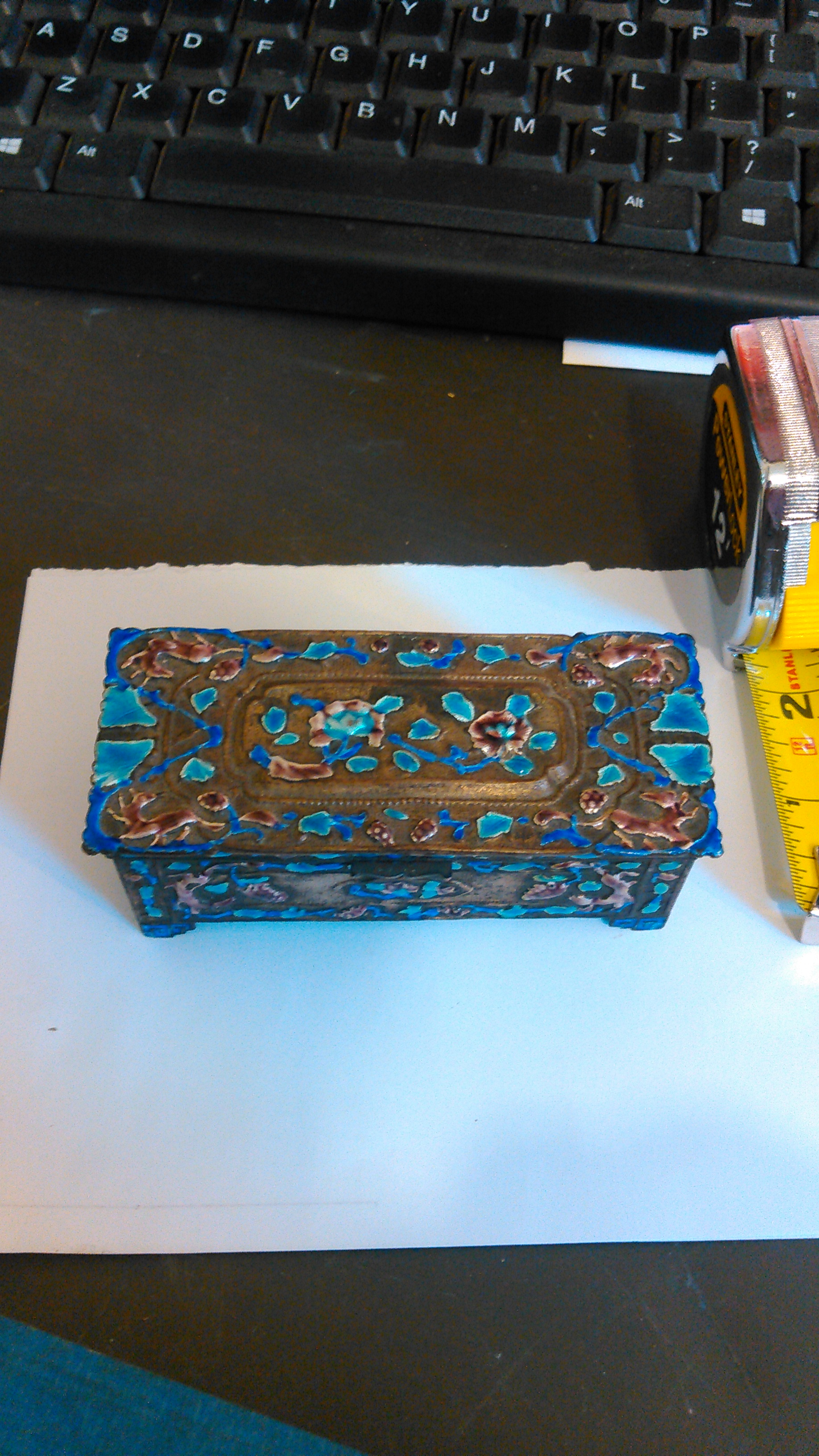 May be silver, metal trinket box, enameled, maked china on the bottom, 11/2 inches wide, 33/4 inches long.