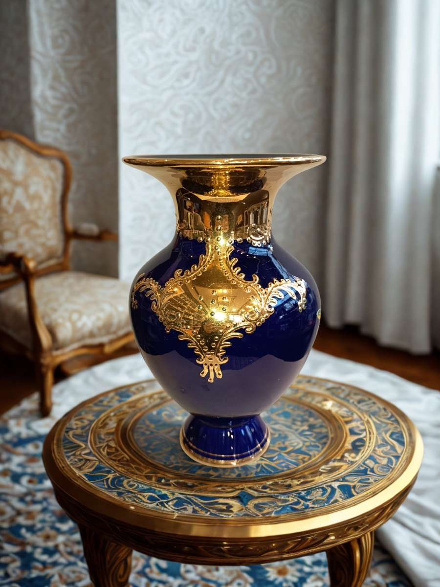Physical Description: This decorative vase features a striking cobalt blue body adorned with intricate gold detailing. The vase has a flared rim and a bulbous body, tapering down to a round base. The dimensions are approximately 10 inches in height and 5 inches in diameter at the widest point. The surface is smooth with a glossy finish, and it is embellished with hand-painted floral motifs in white and green.