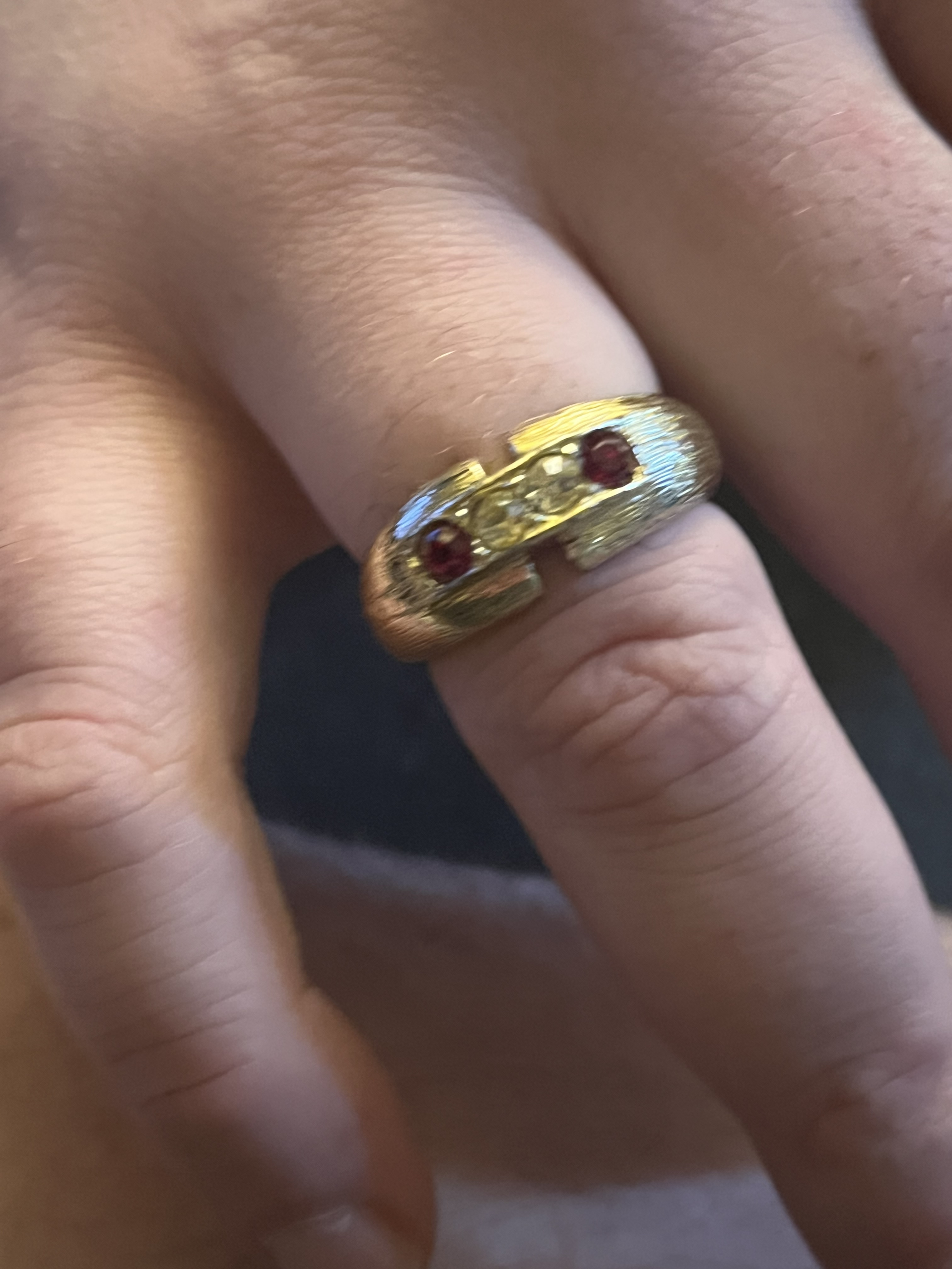 Decorative Gold Ring with Gemstones. Dating to 1970s to 1990s. Materials: Gold-tone metal with synthetic gemstones (two red stones and one yellow stone).. Estimated value: $30 – $50. Condition: Very Good. The market for fashion jewelry is currently stable, with moderate demand for vintage pieces. Prices are generally consistent, with some fluctuations based on style and materials.