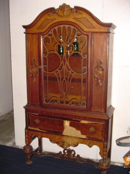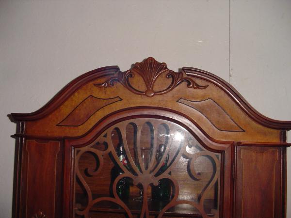 This hutch has 3 shelves enclosed in a glass framed door and 1 draw below it. The glass door is inlayed with a wood design. The piece is beautifully designed from top to bottom with carved features. It has been damaged in multiple places and will need to be refinished.