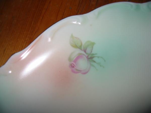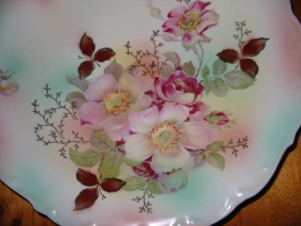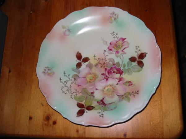 This is a beautiful plate in reall great condition. It does have a small chip and crack on the outside edge. Other than that, the plate is in perfect condition. The colors on the plate are light and medium pink, mint green and gold. The outside edge is trimmed in gold also. If you have any other questions about the plate just e-mail me at [email protected] and I will respond back ASAP.