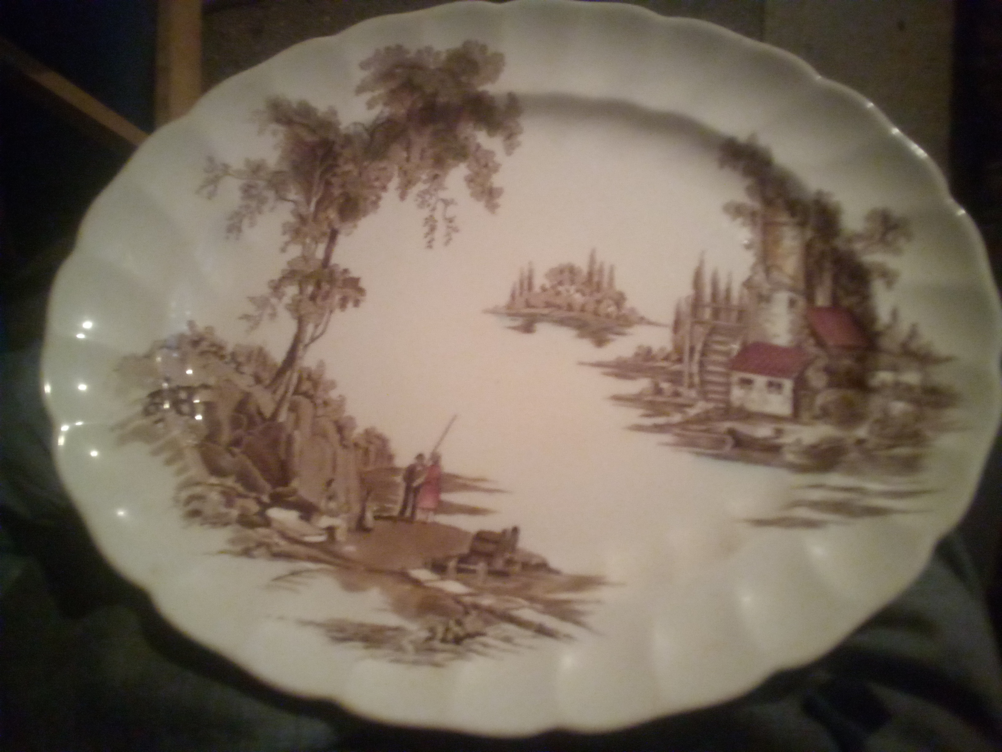 Physical Description: This decorative plate features a picturesque scene with a landscape depicted in muted browns and greens. The plate measures approximately 10 inches tall and 12 inches wide, with a scalloped edge design. It is made of porcelain, which is known for its durability and fine finish. The back of the plate is stamped with the maker's mark, "The Old Mill Made in England" along with additional details about the craftsmanship.