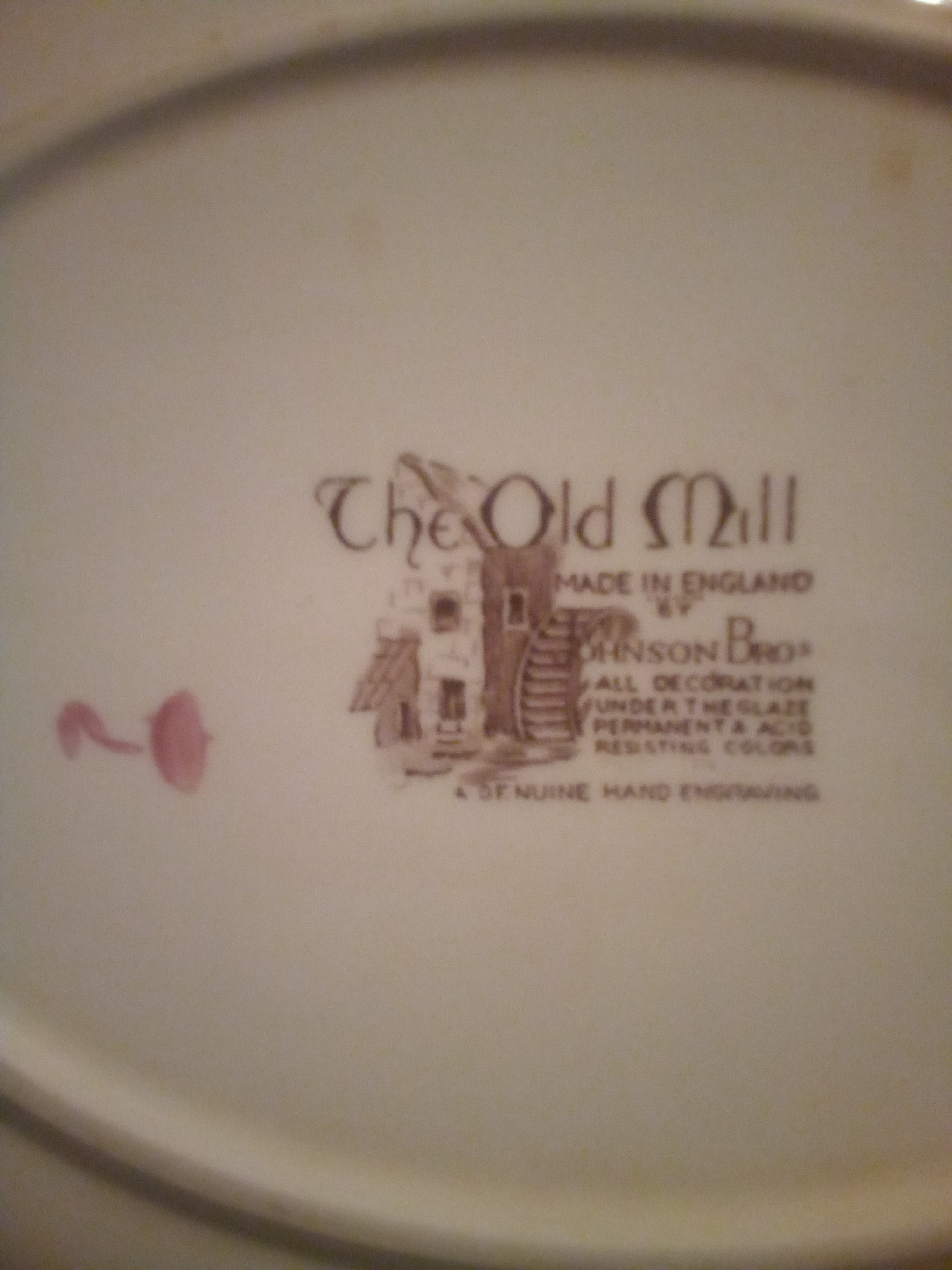 Historical Context: The Old Mill is a brand associated with the Johnson Brothers, a well-known English pottery company established in the early 19th century. They specialized in transferware and decorative china, often featuring pastoral and romantic scenes. This plate likely dates to the mid-20th century, a period when such decorative pieces were popular in both functional and display contexts.