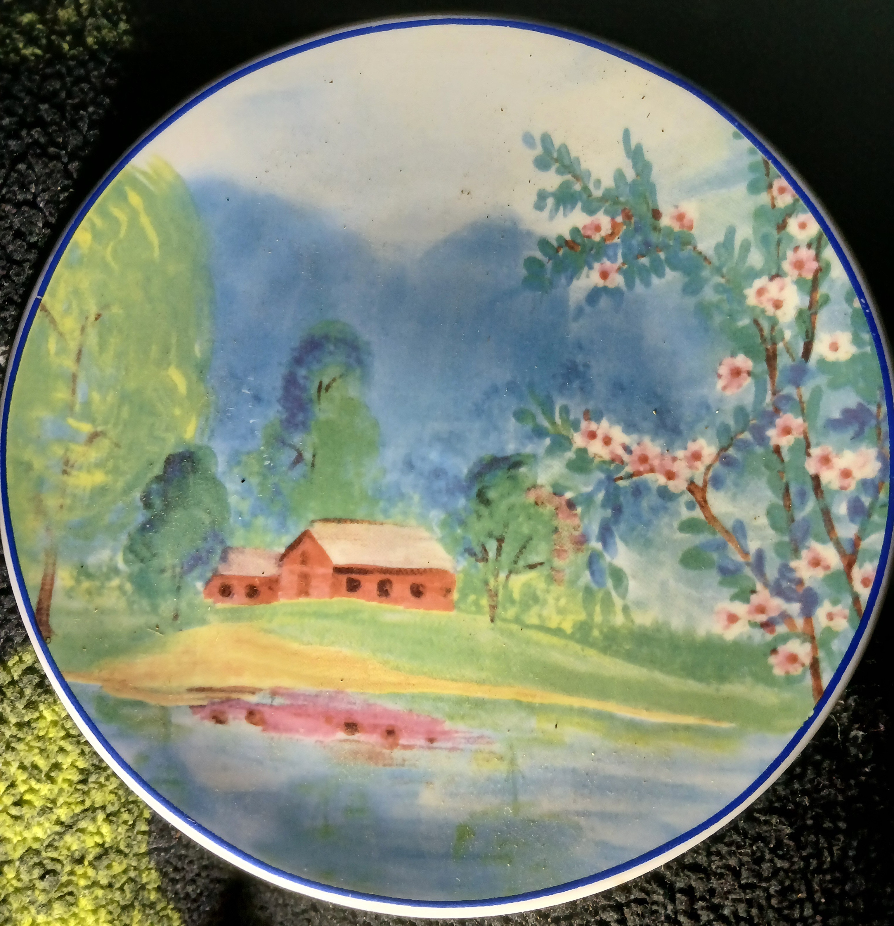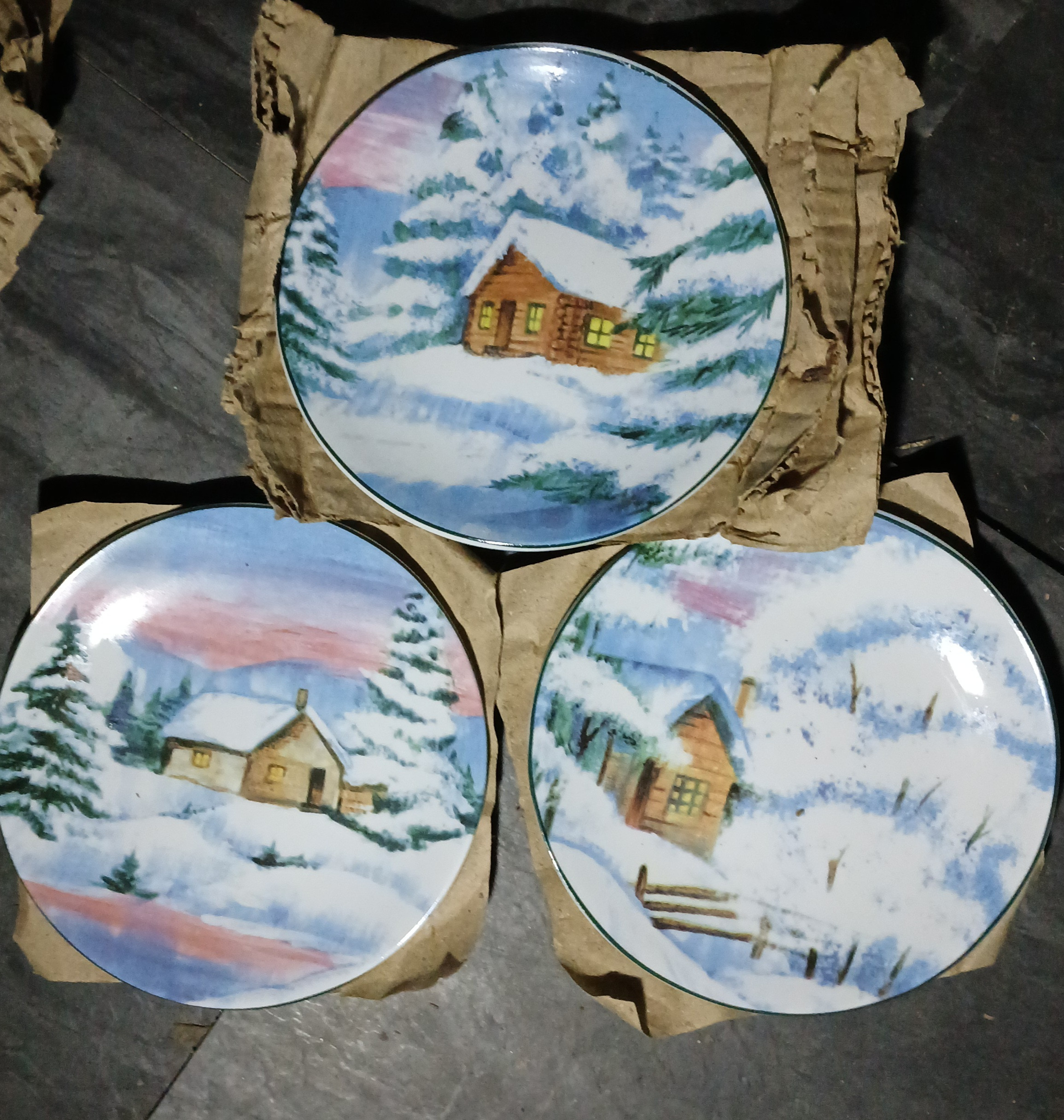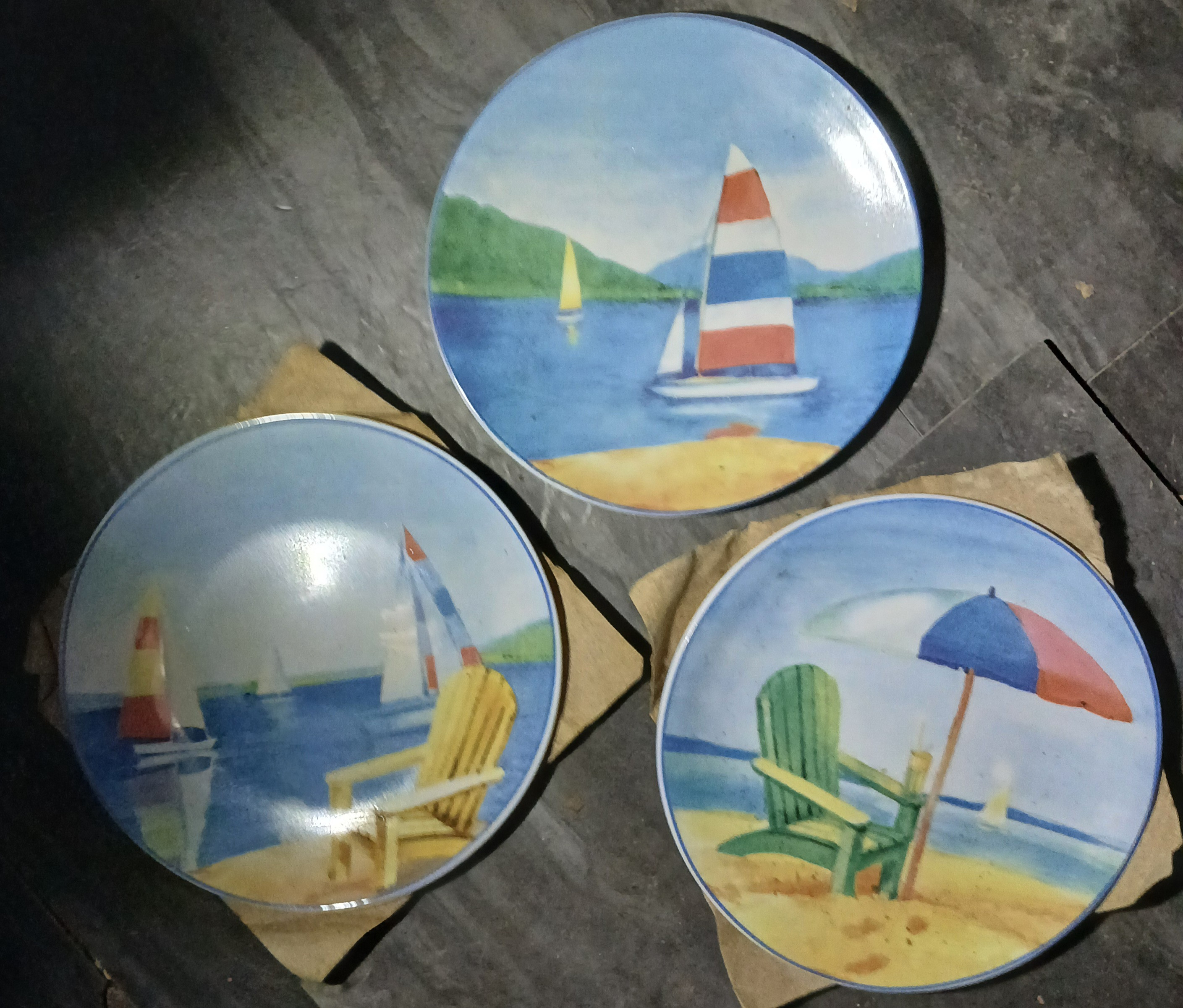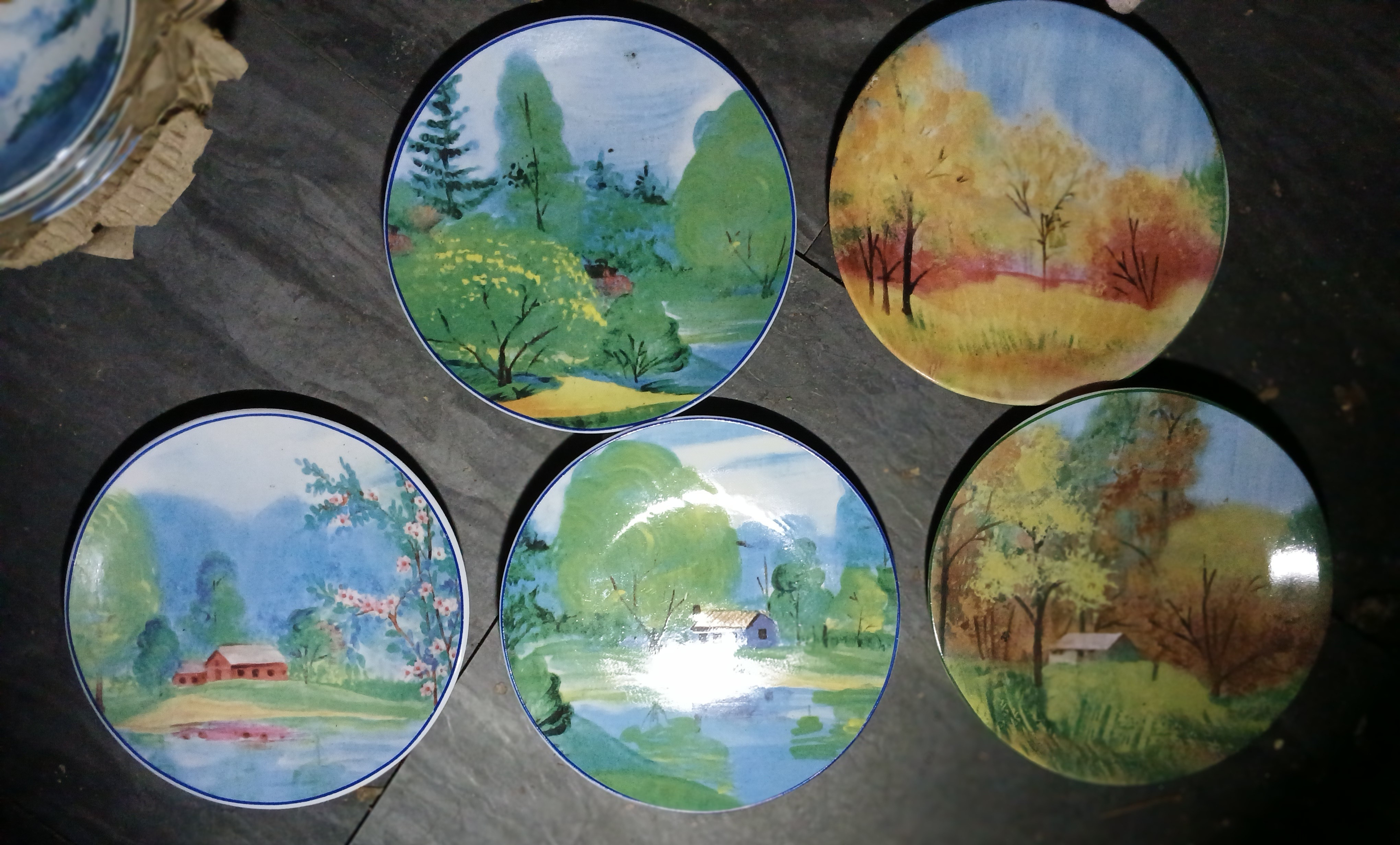 This is a set of hand-painted decorative plates, each featuring vibrant scenic landscapes that depict seasonal and coastal themes. The plates are: