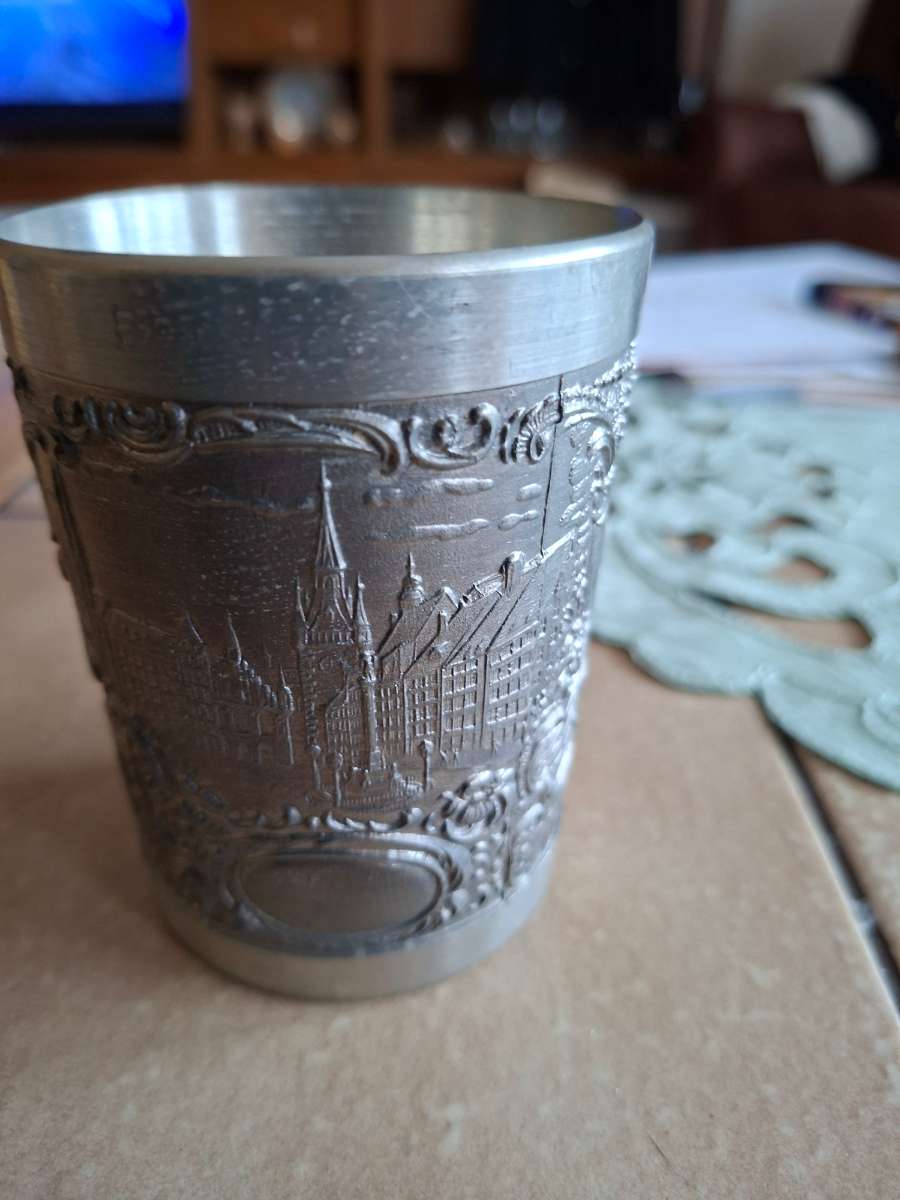 Physical Description: This decorative cup is made of silver, featuring intricate embossed designs depicting a cityscape. The cup has a cylindrical shape with a smooth, polished rim. The dimensions are approximately 4 inches in height and 3 inches in diameter. The weight is estimated to be around 200 grams. The surface displays detailed engravings of buildings and towers, suggesting a historical or cultural significance.