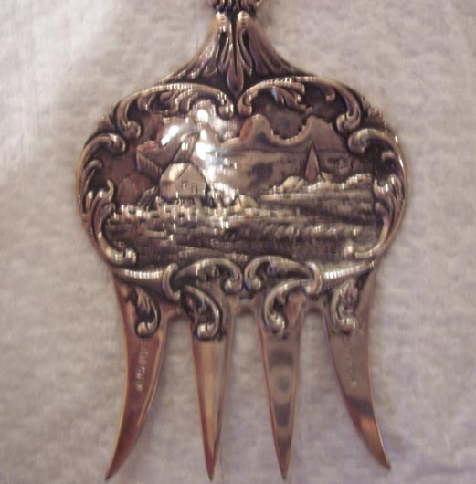 Description My mother gave me several old silver serving fork.  I do not know the history or their value.  The top of the fork has a woman carring two buckets.  The bottom has a countryside scene with a windmill depicted.  There is a small tag attached to the fork that says Holland Silver Town.  One of the forks has the name J. Pluut on it.  Another fork has the word Holland stamped on it.  If anyone has any knowldge of this fork origin or value I would be appreciative