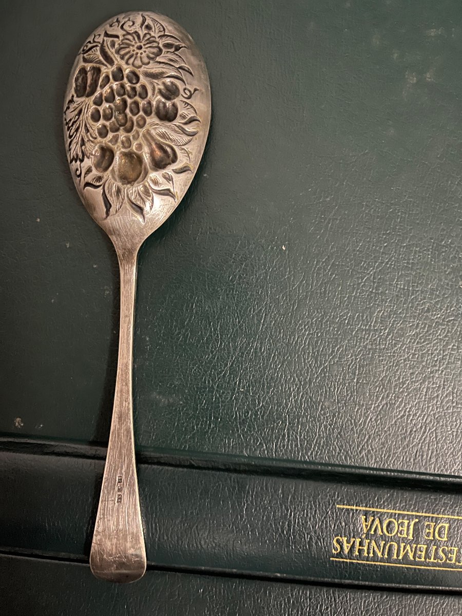 Physical Description: This decorative spoon features an ornate design with a floral and fruit motif, prominently displaying grapes and leaves. The spoon is made of silver, likely silver-plated, given its age and design. The dimensions are approximately 7.5 inches in length and 2 inches in width at the bowl. The handle is intricately designed with additional floral patterns, enhancing its aesthetic appeal.