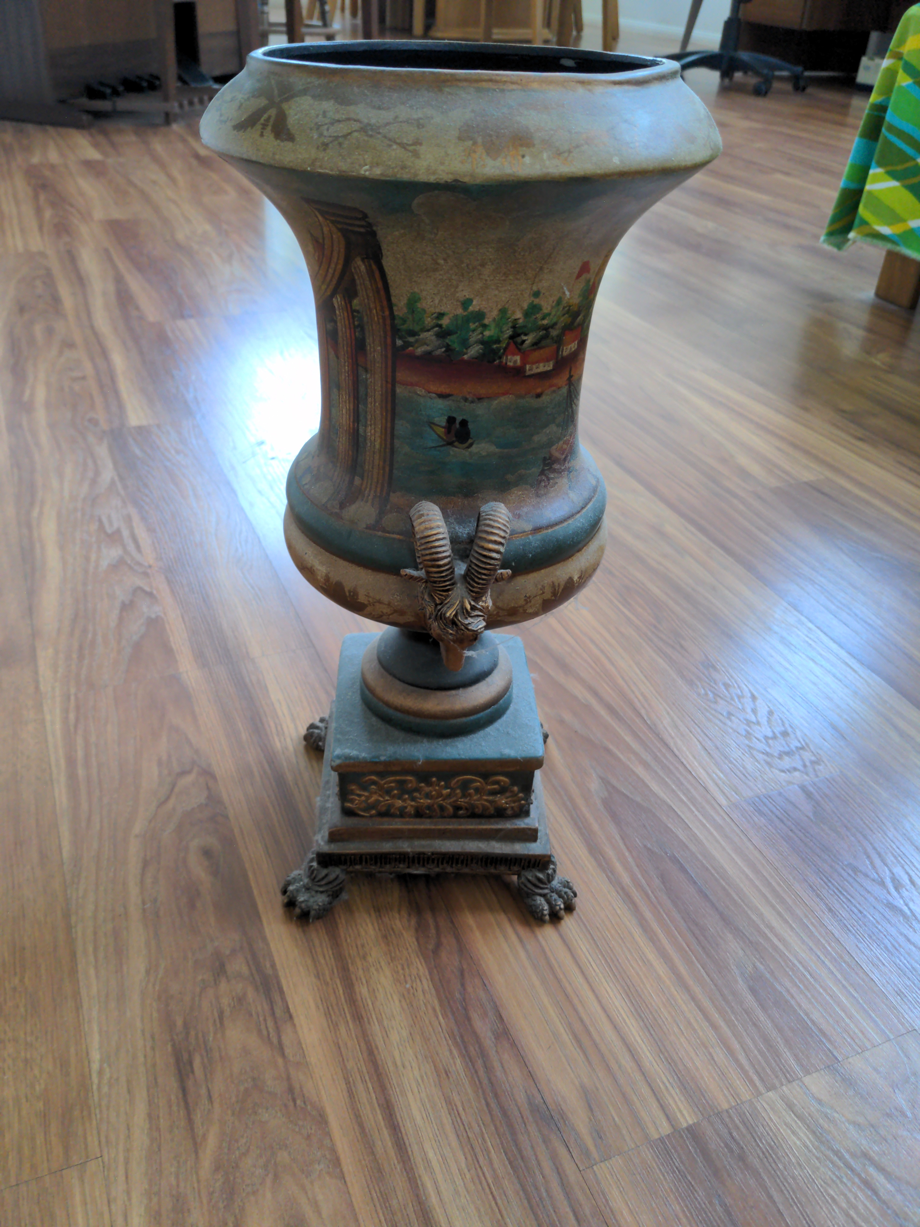 Decorative Urn. Dating to c. 1900-1930. Materials: Ceramic with painted scenes and metal base. Estimated value: $150 – $300. Condition: Good. The market for decorative urns is stable with moderate demand.