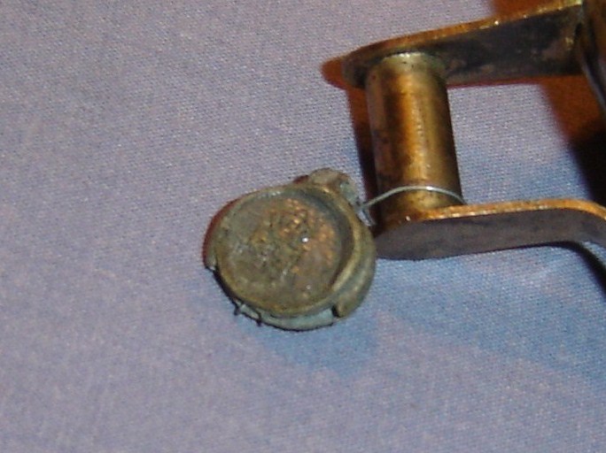 SCENES OF ANIMALS (OX MAYBE) TRIBESMAN AND TREES.  A STONE/LEAD LOOKING OBJECT LIKE A SMALL COIN IN SHAPE ATTACHED BY A WIRE TO THE HANDLE.  ONE SIDE LOOKS TO BE A CROWN & SHIELD/CREST AND THE OTHER HAS SOME SMALL WRITTING AROUND THE EDGES WITH SOMETHING IN THE MIDDLE.
