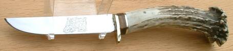 Real nice hand made deer antler knife. About 18hrs of work on this piece. Fits perfectly in your hand. The actual knife looks very similar to this one (I had to find a picture off the web). The two major differences between them are that the bit between the blade and the handle is more simple and brass and the blade itself is not as narrow or long.
