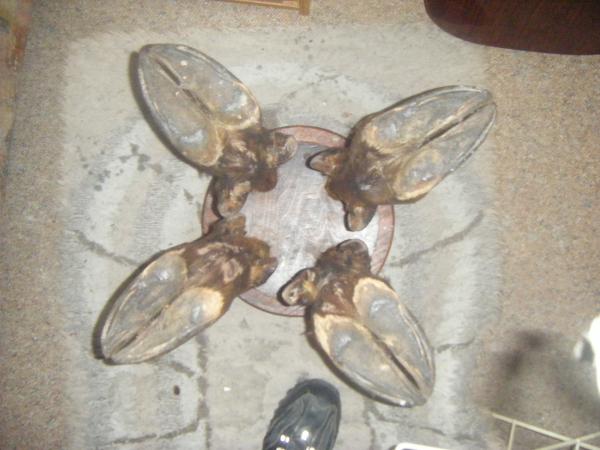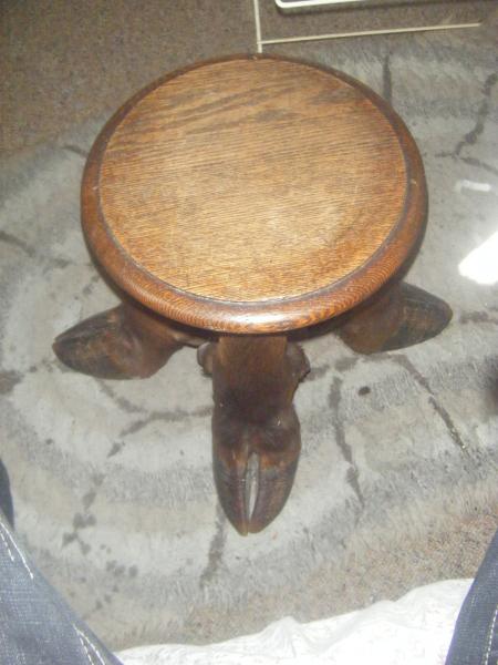 4 legged deer leg stool with top made from either walnut or cherry i think