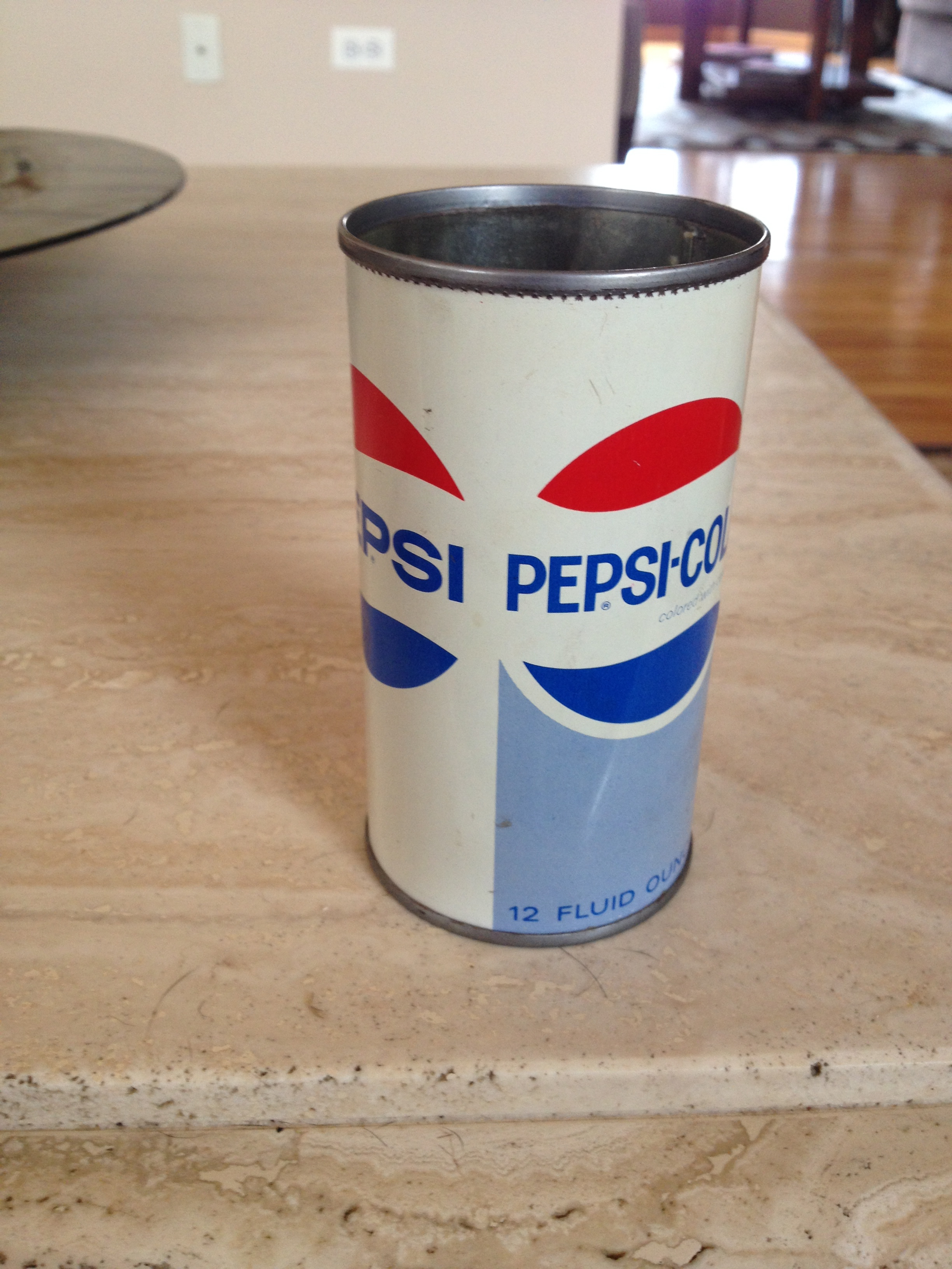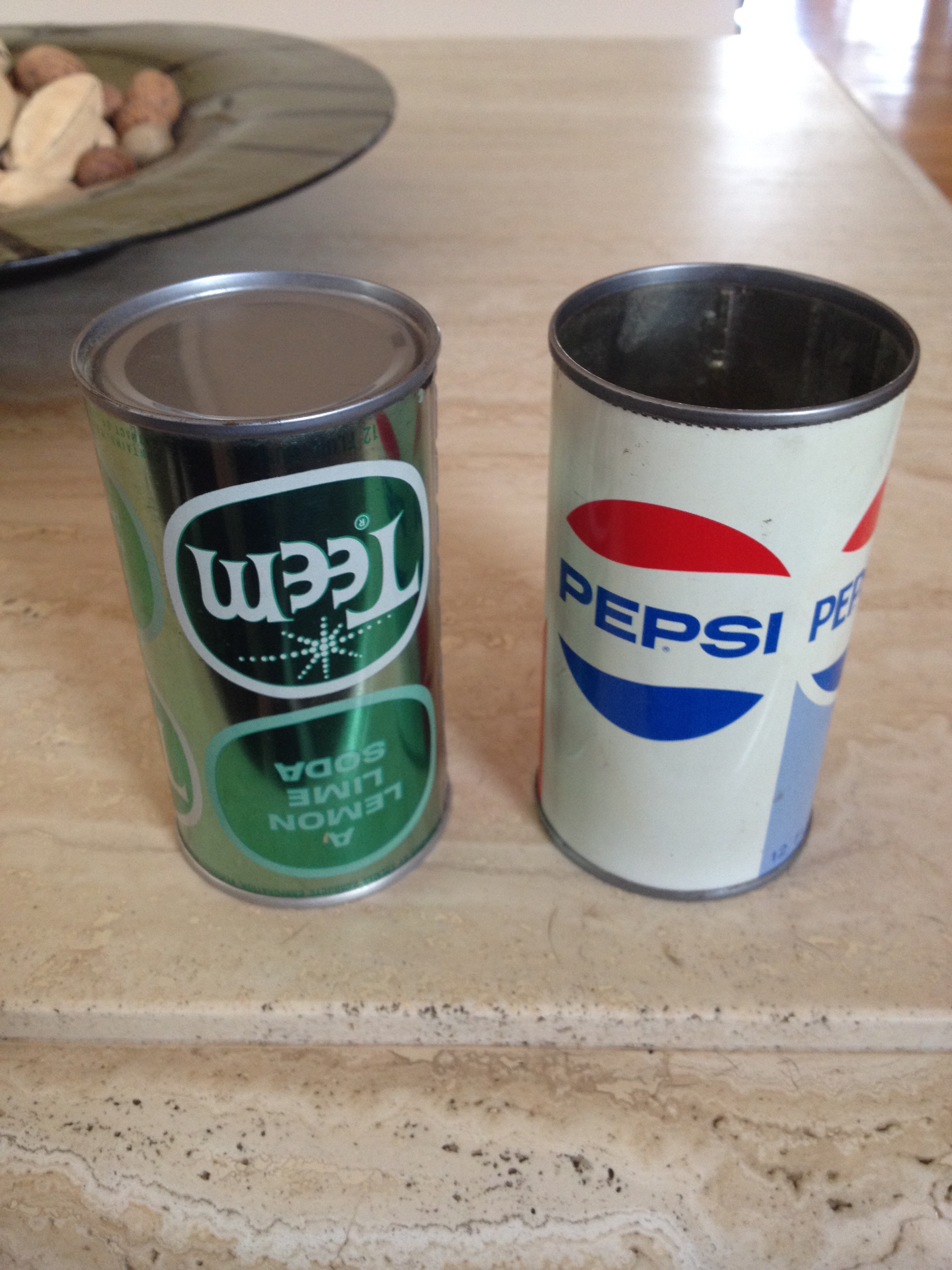 Both of these can were found in an old vending machine, years ago. The Pepsi can can from the manufacturer without a top lid. The tab was placed on the bottom of the can.