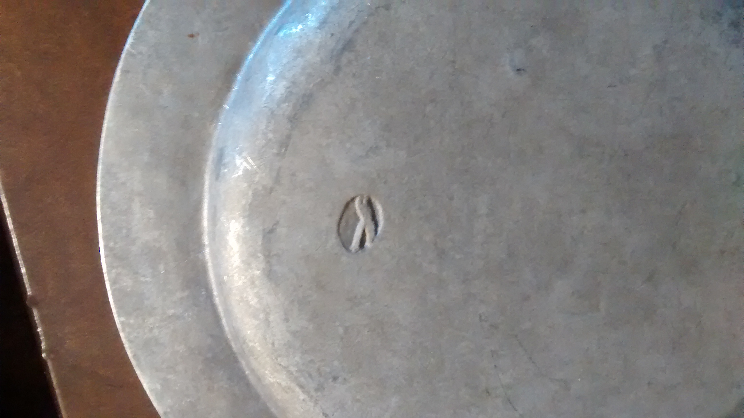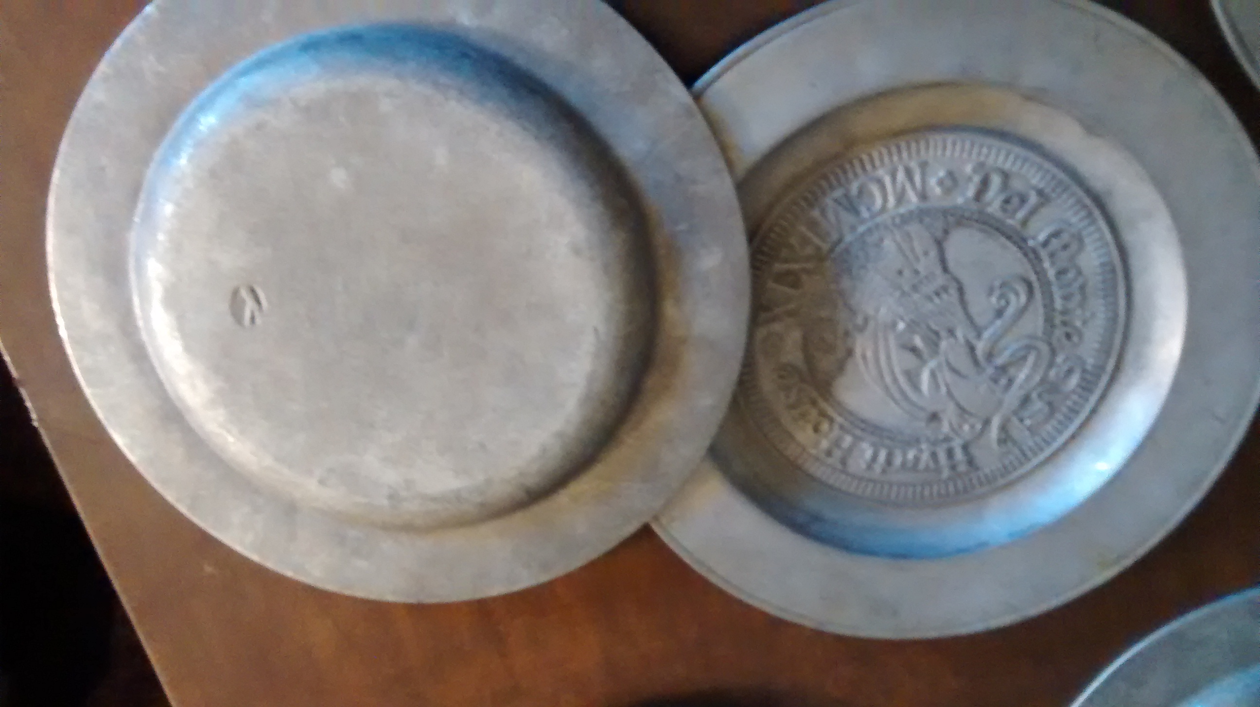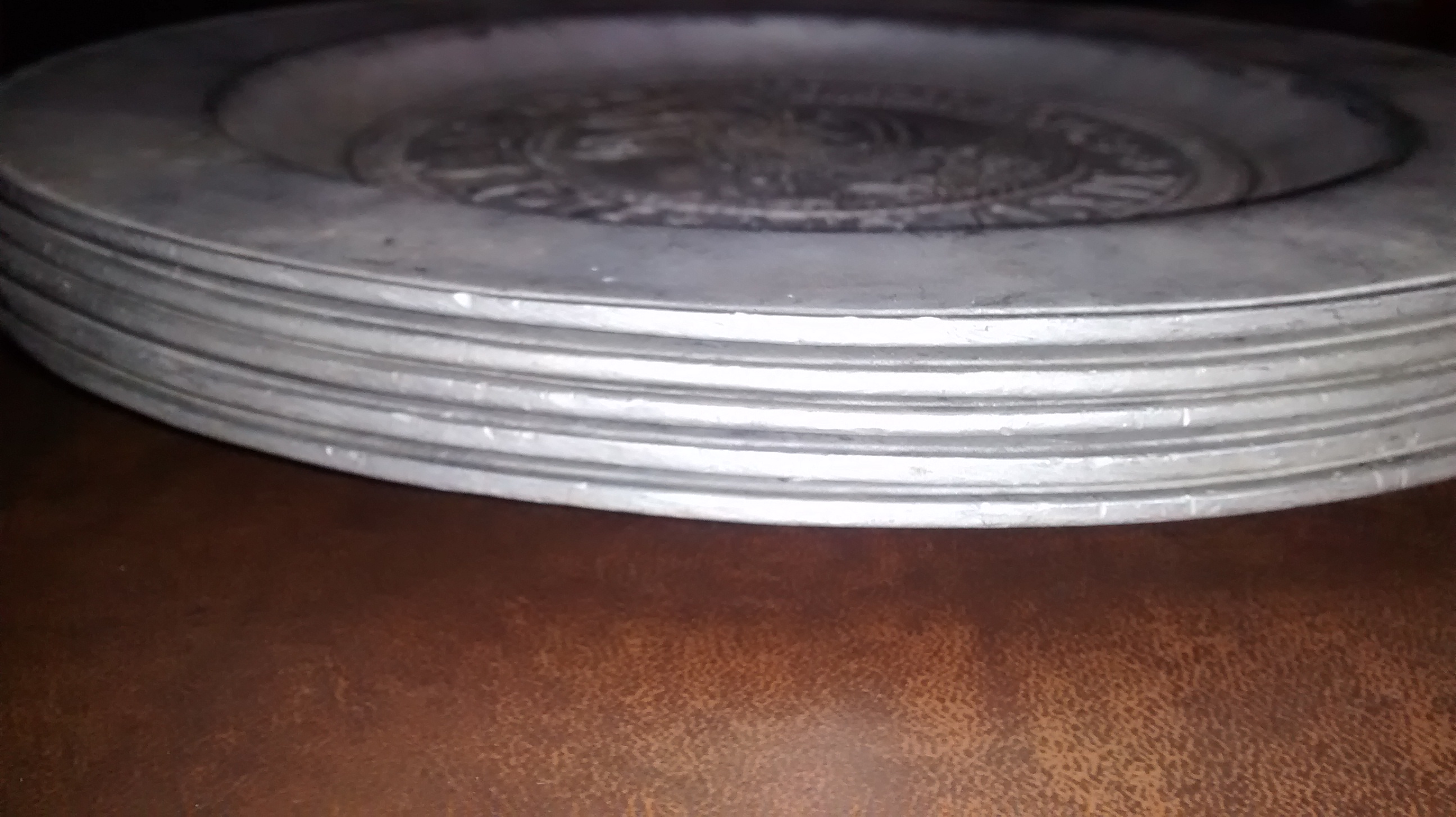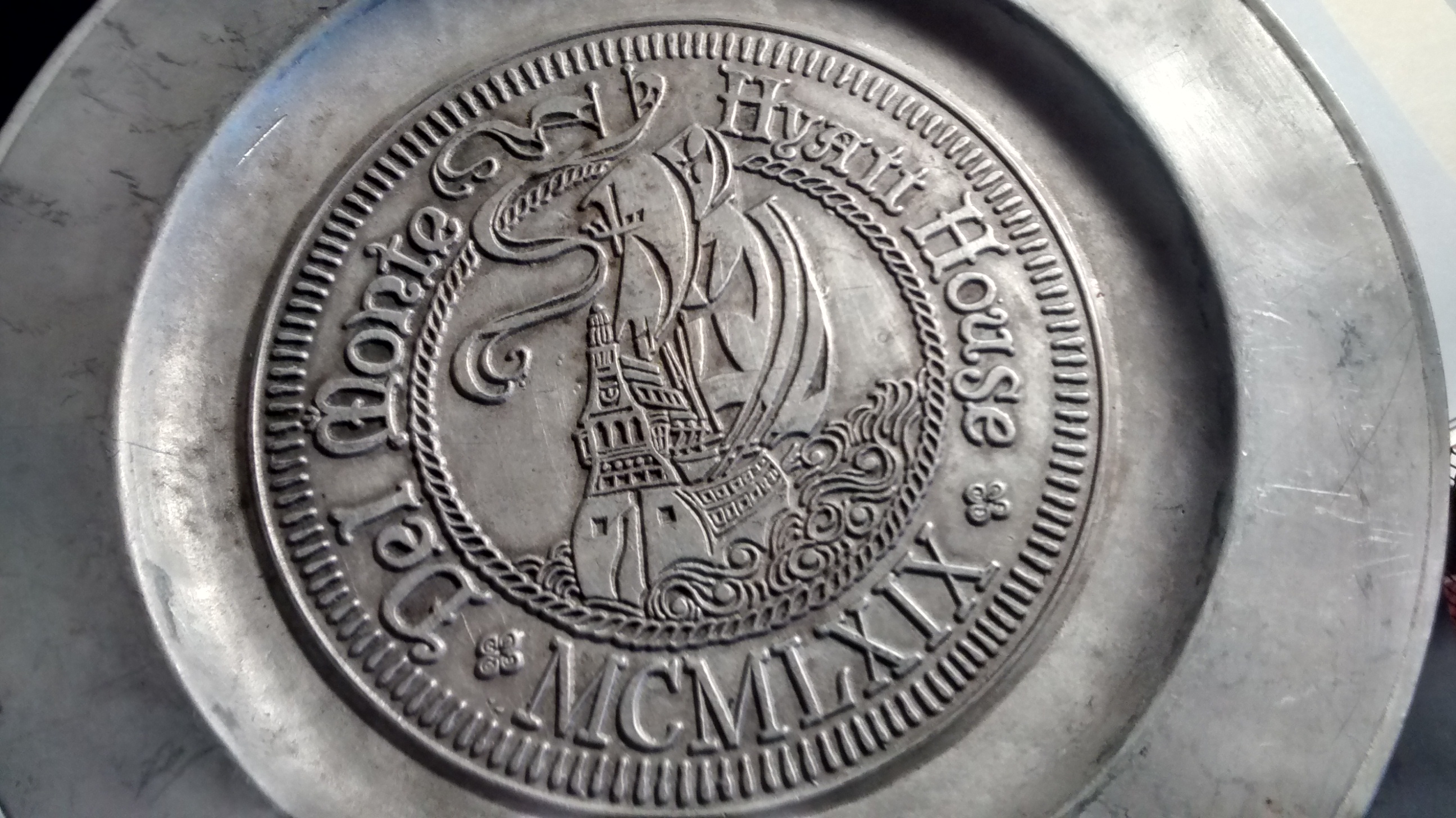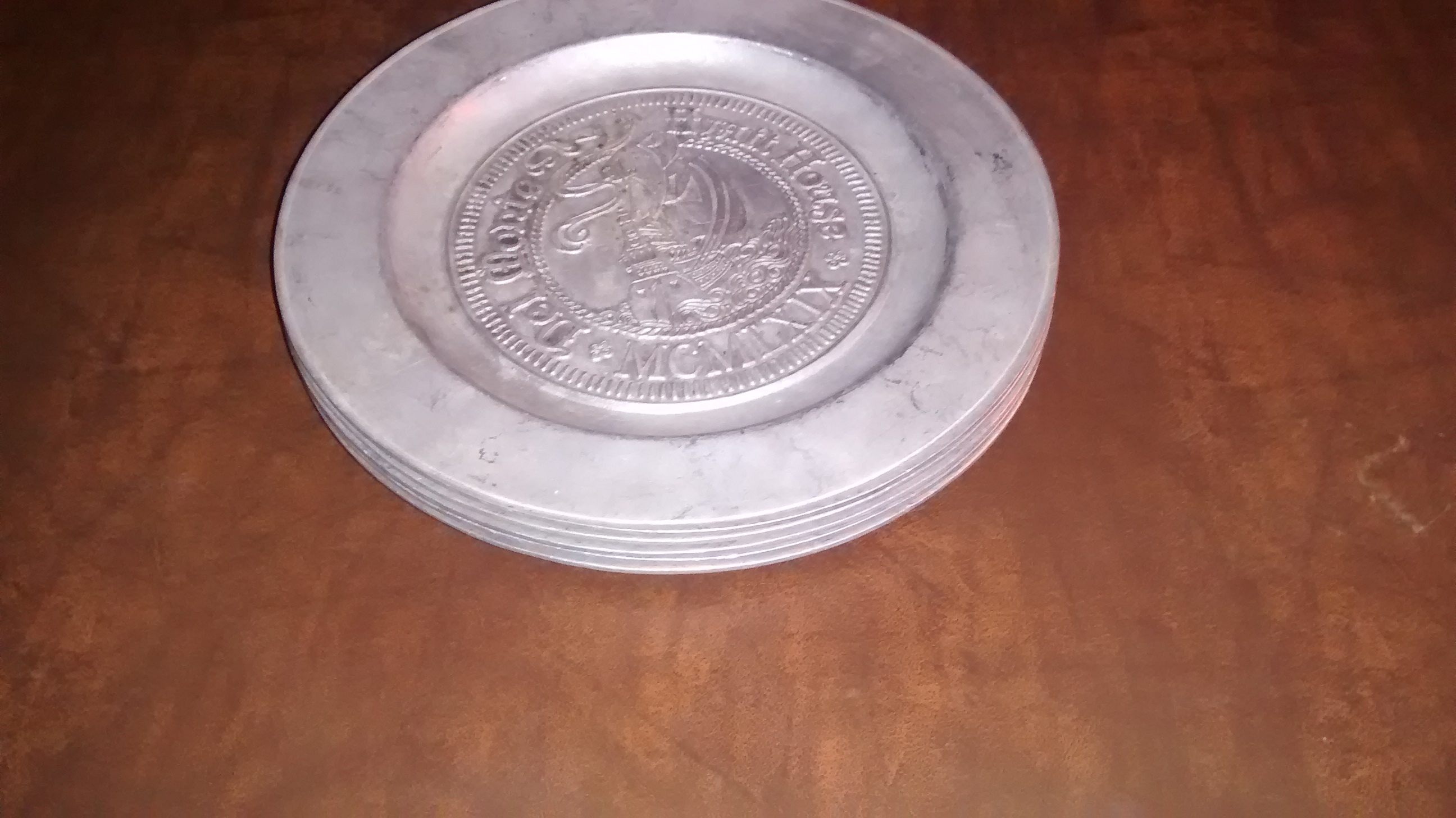 Five 11" Pewter Plates. Engraved Del Monte Hyatt House MCMLXIX with engraved ship. Purchased at auction and researched possibly to be part of original Hyatt House in Monterey, Ca, USA. Back side has marking as listed in photo.
