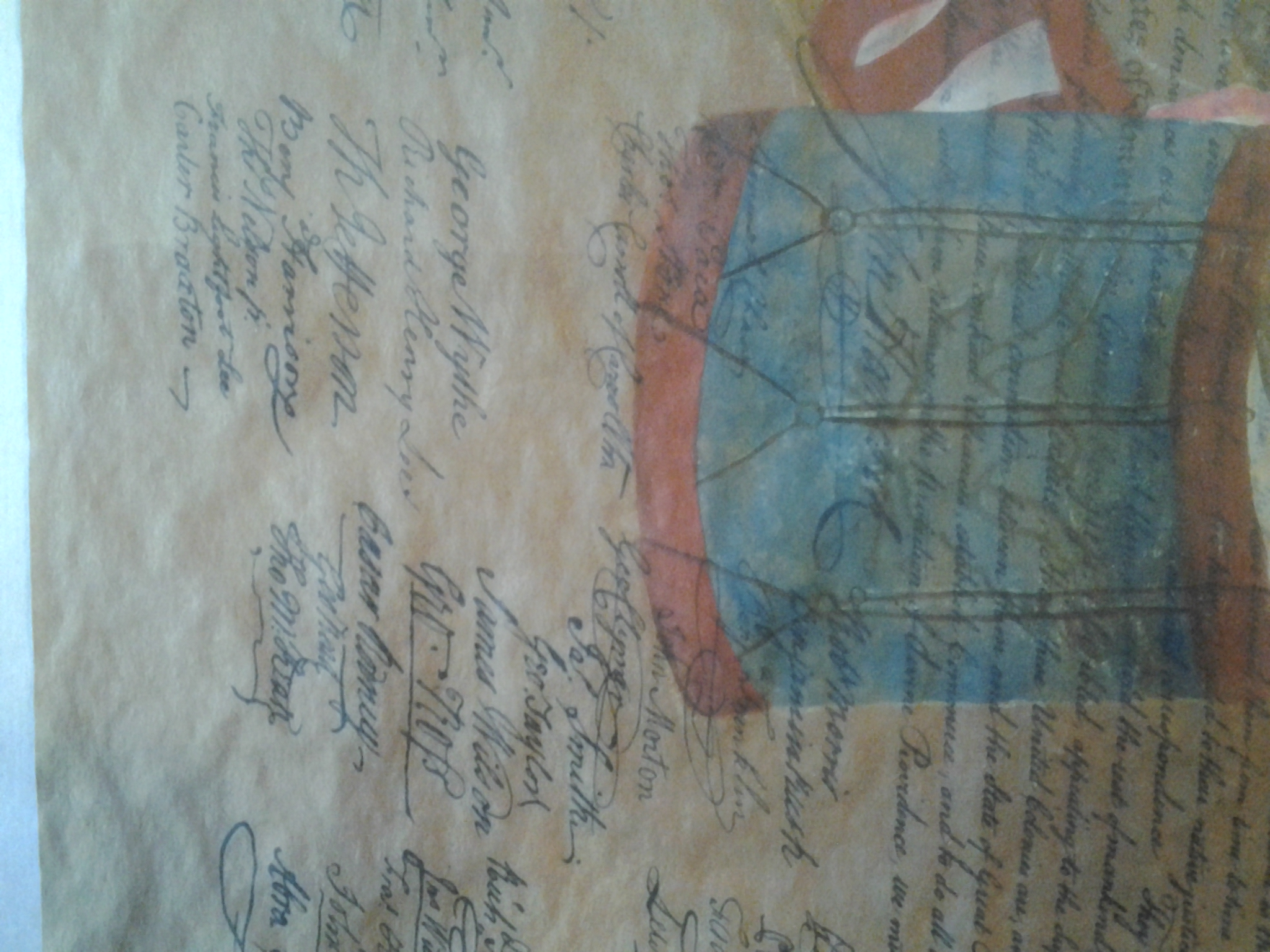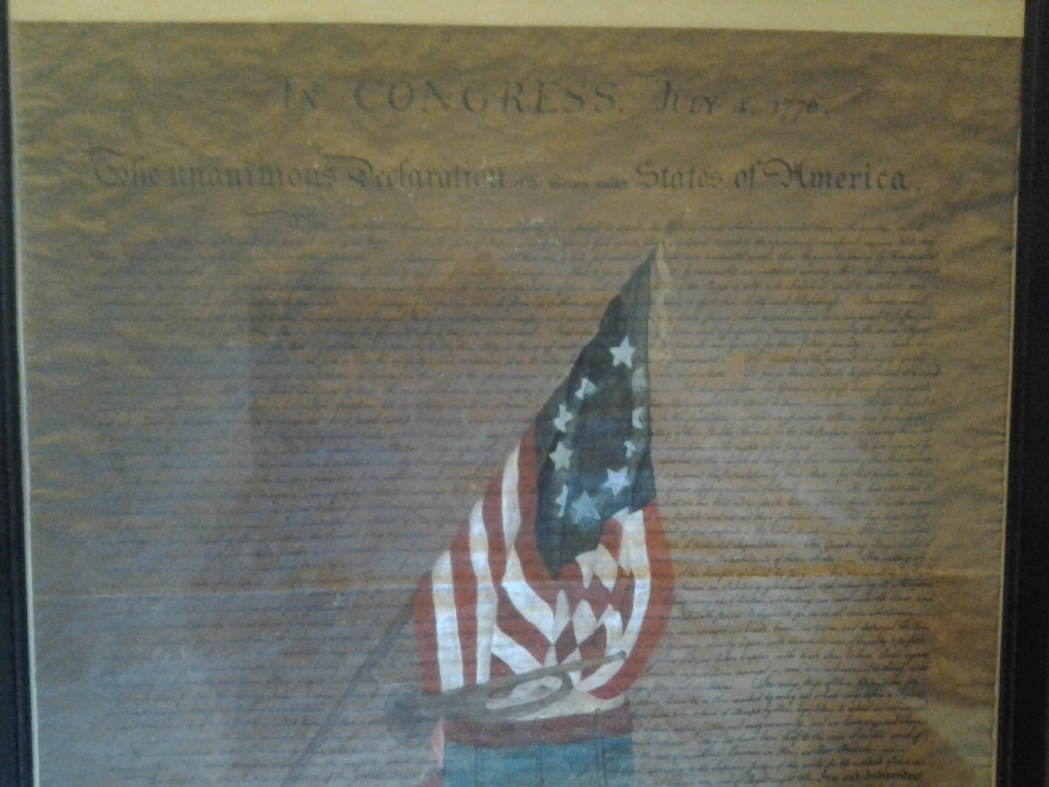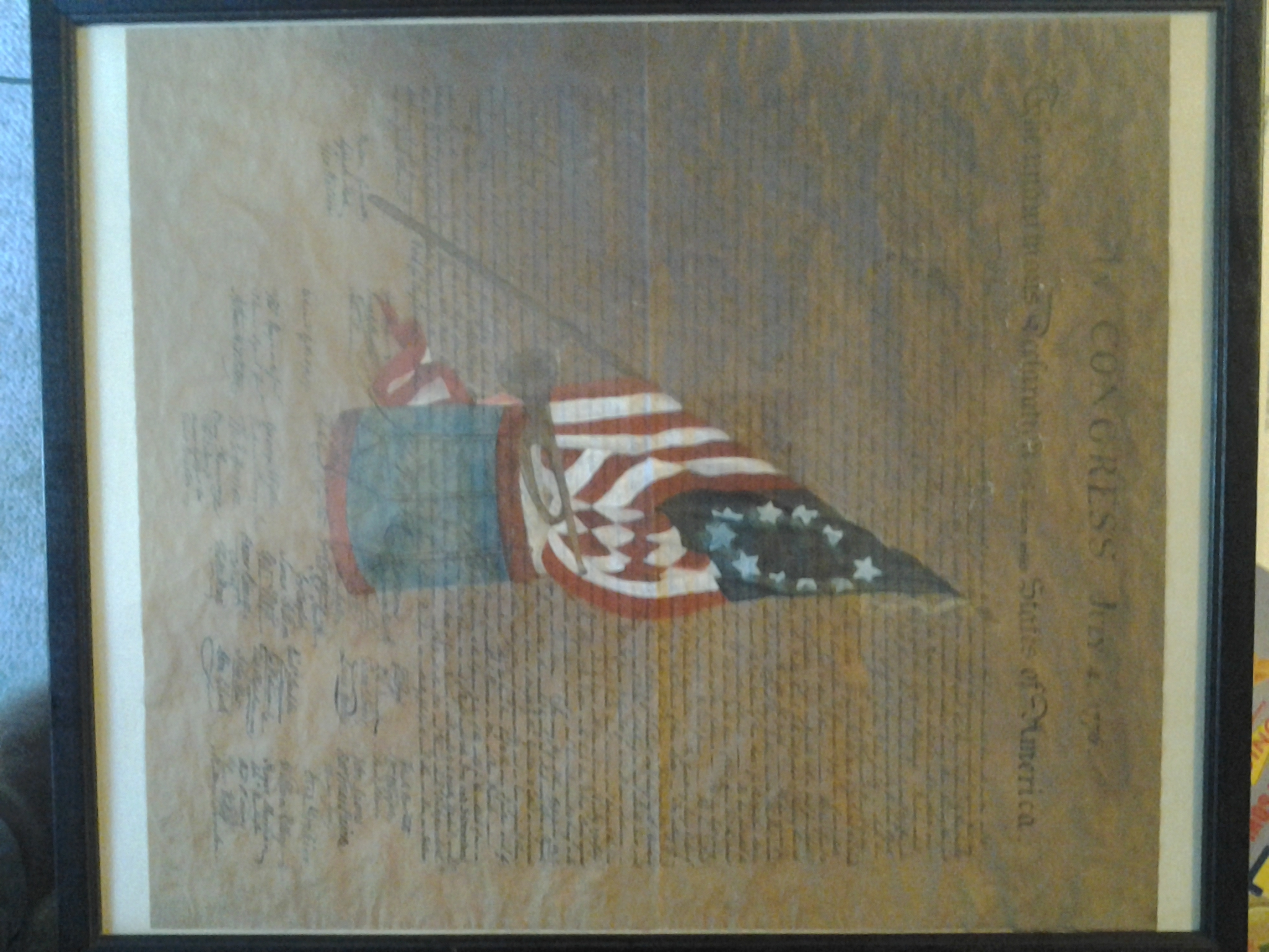 delaration of independent copy, paper is bumpy and stiff with age, there is a hand painted American flag with trumpet and drum.