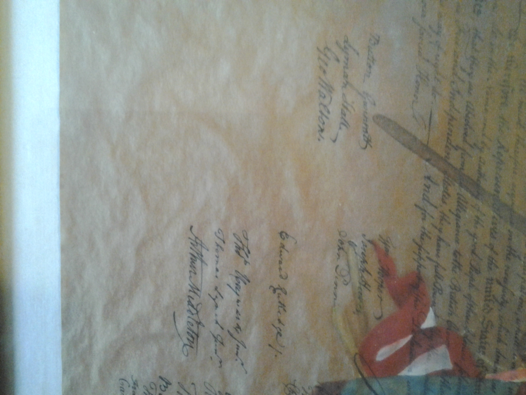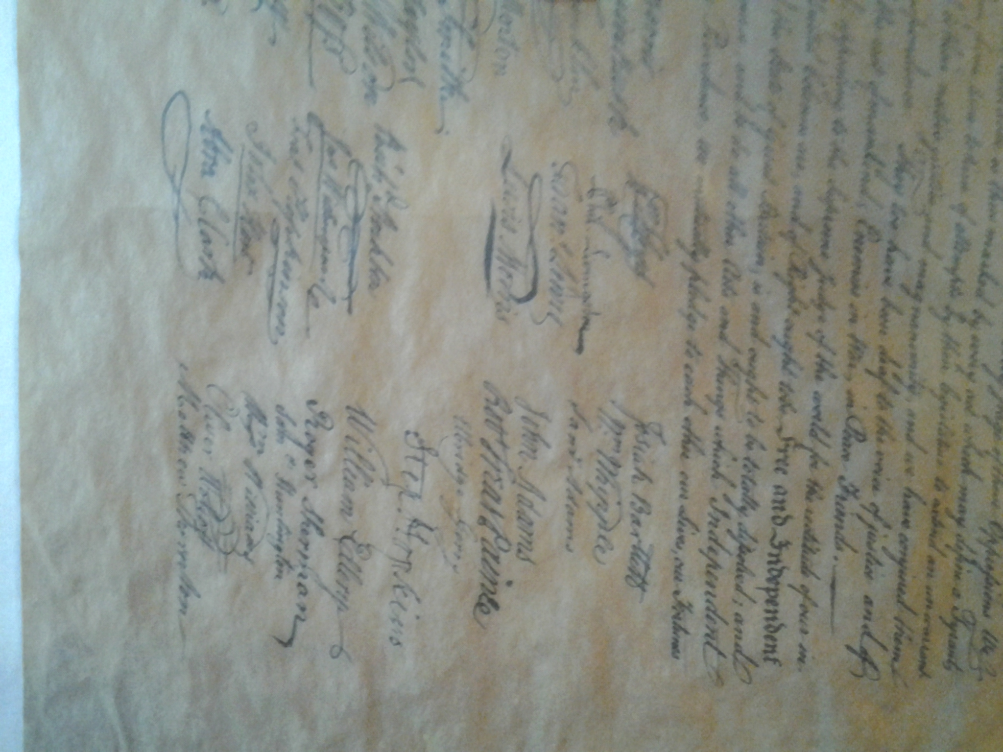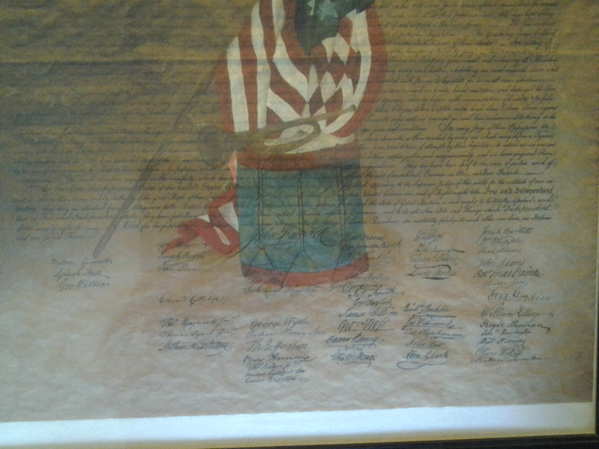 delaration of independent copy, paper is bumpy and stiff with age, there is a hand painted American flag with trumpet and drum.