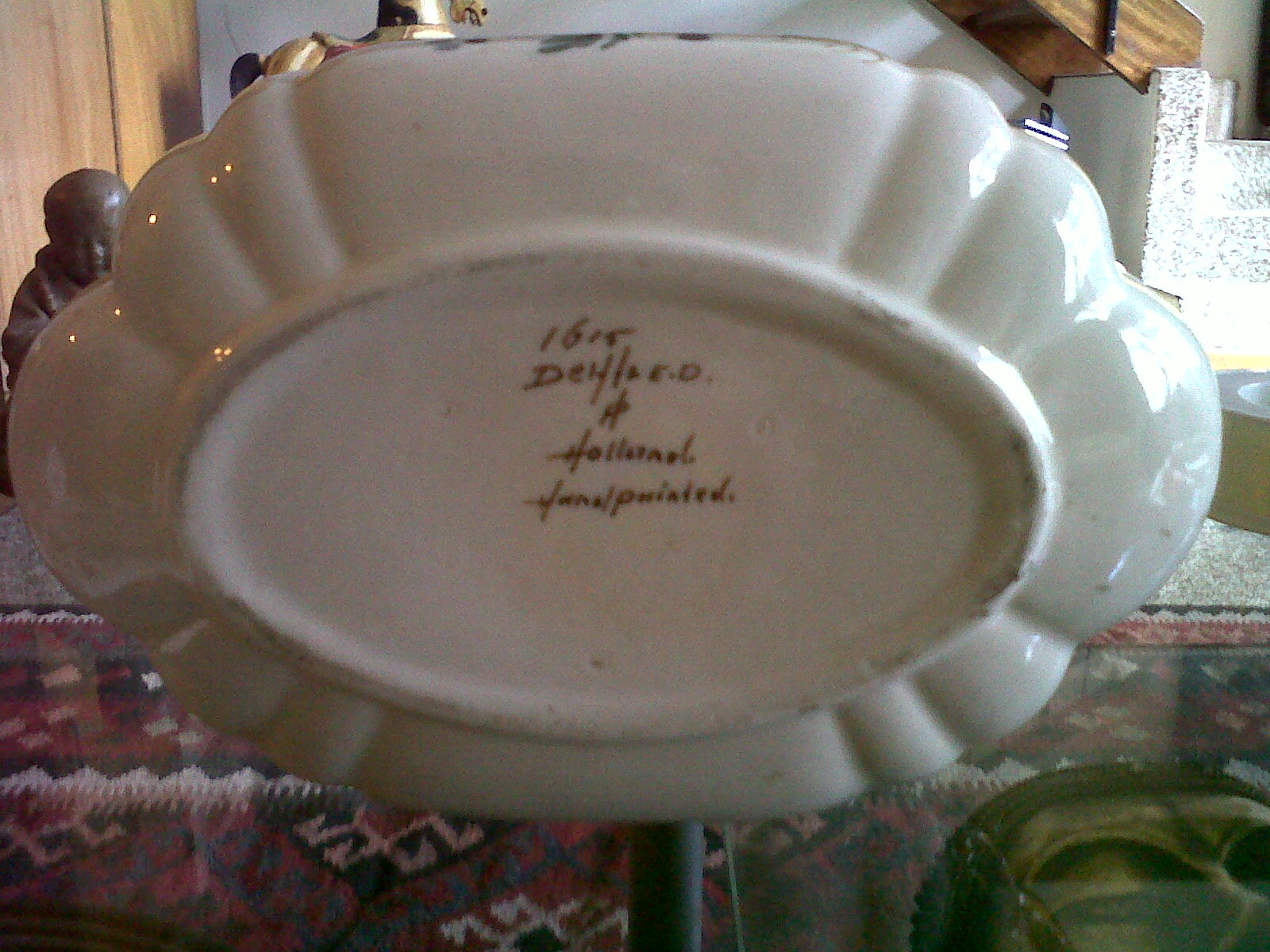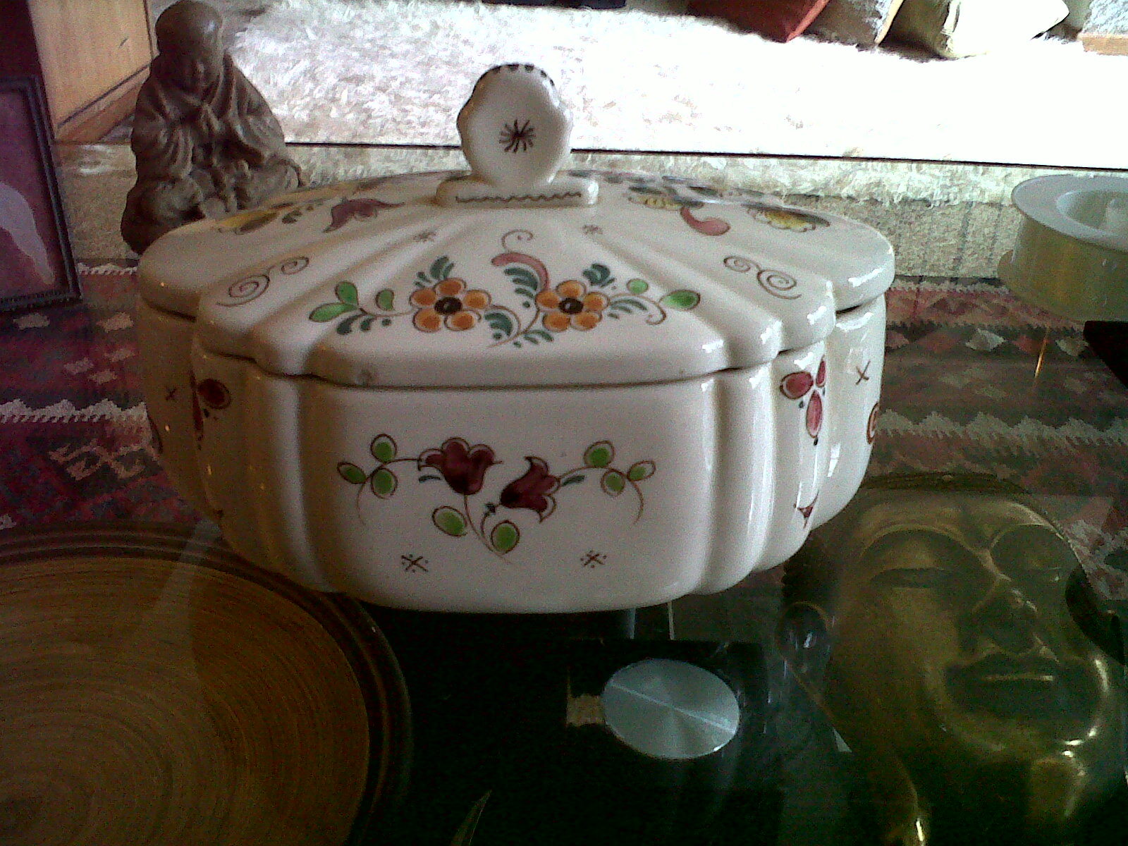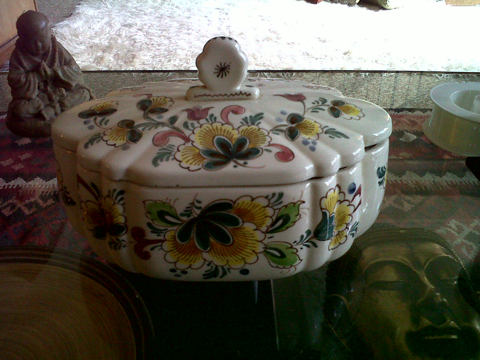 Oval, scalloped bowl with lid. Family heirloom. Handpainted yellow,green, red. Flowers.