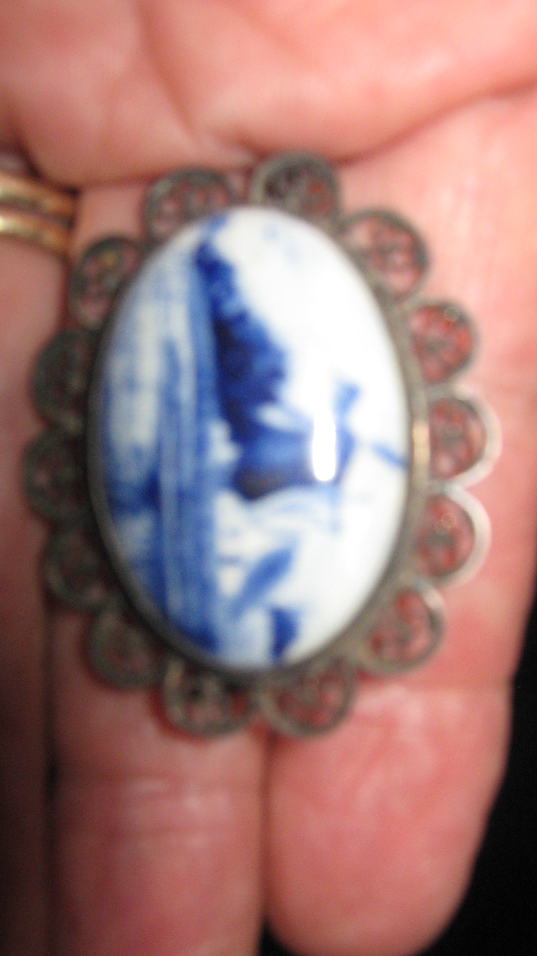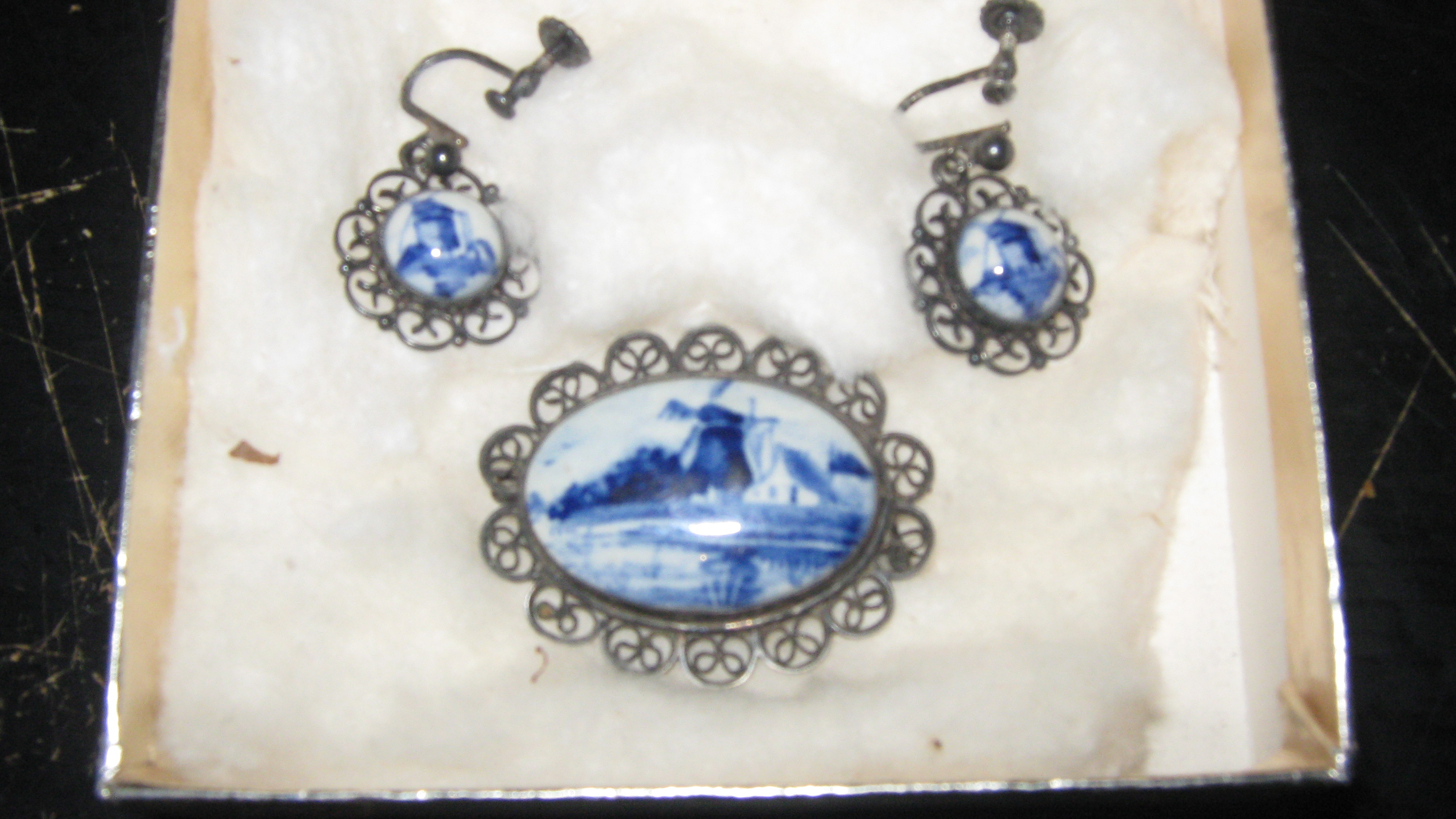pair of delft earrings no markings that i can see , delft brooch marked with an S and a P intertwined and the word delft