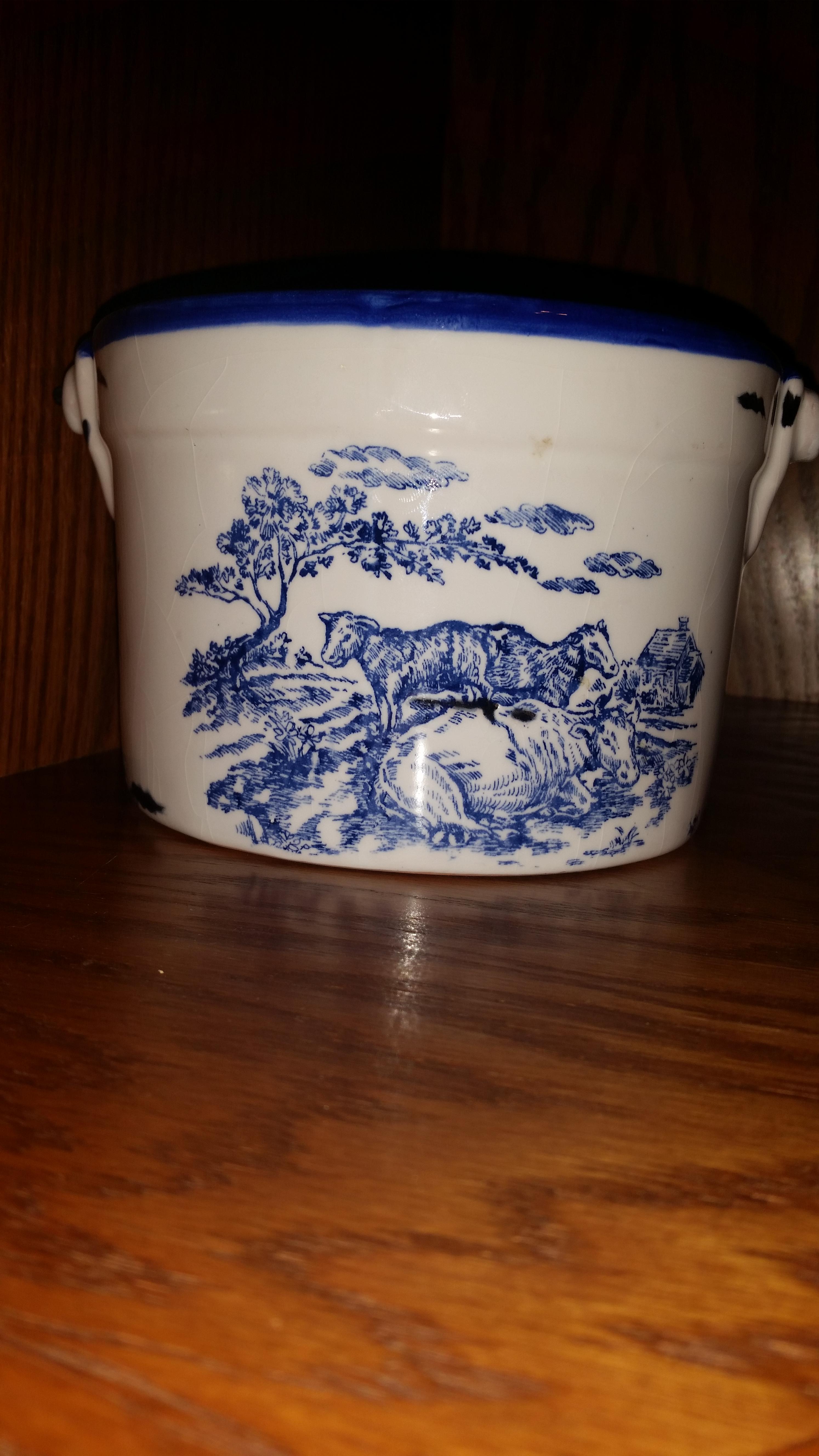 I'm cleaning house and trying to decide what is worth keeping, selling, or tossing of things that I have accumulated over the years. This piece is blue and white with one side having a floral design and the other side having a scene of cows, a tree, and house/barn. On the bottom is engraved and painted with the word "MAXCERA". there is also a partcially ripped off barcode that seems to have had Maxcera printed on it