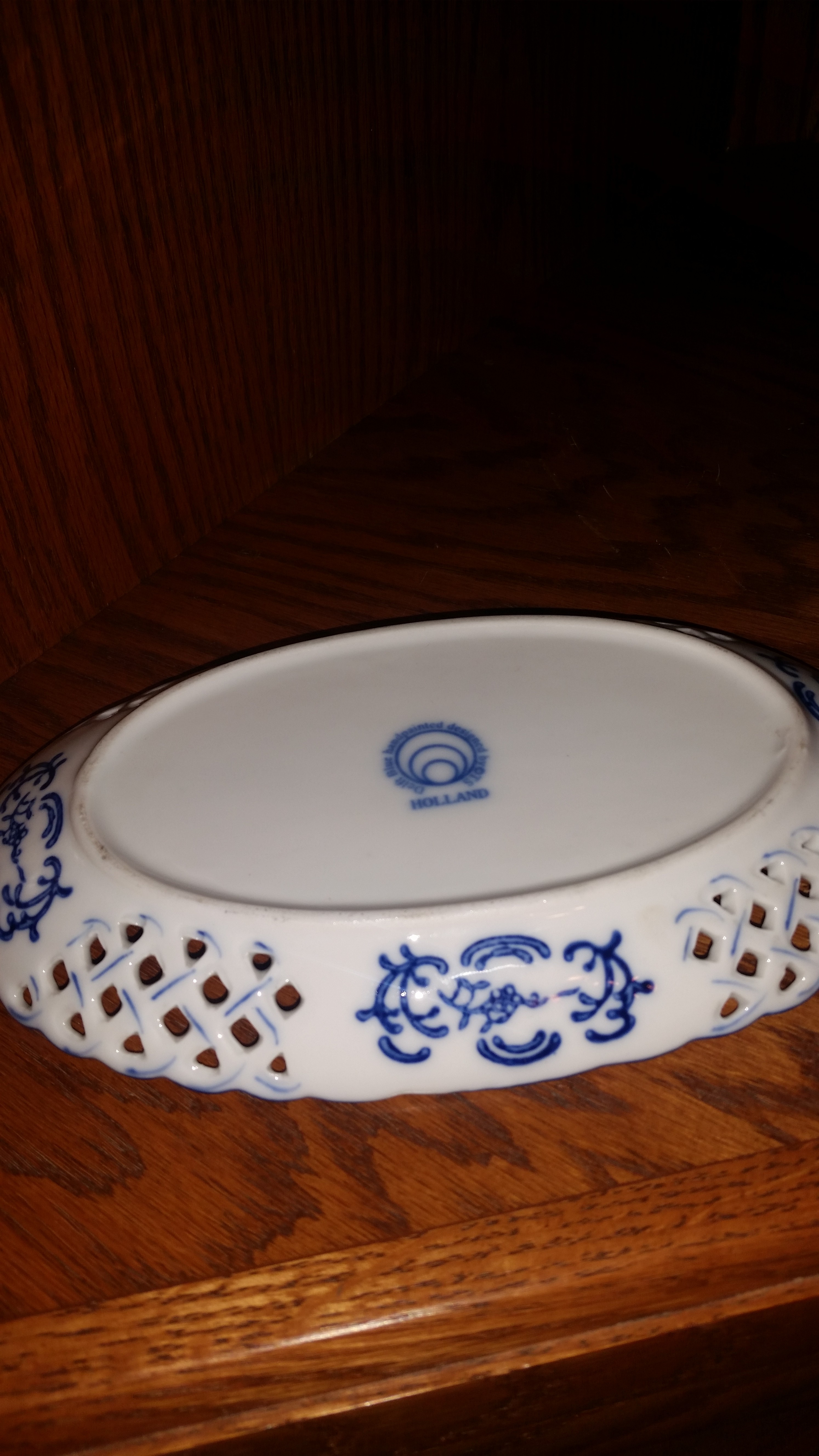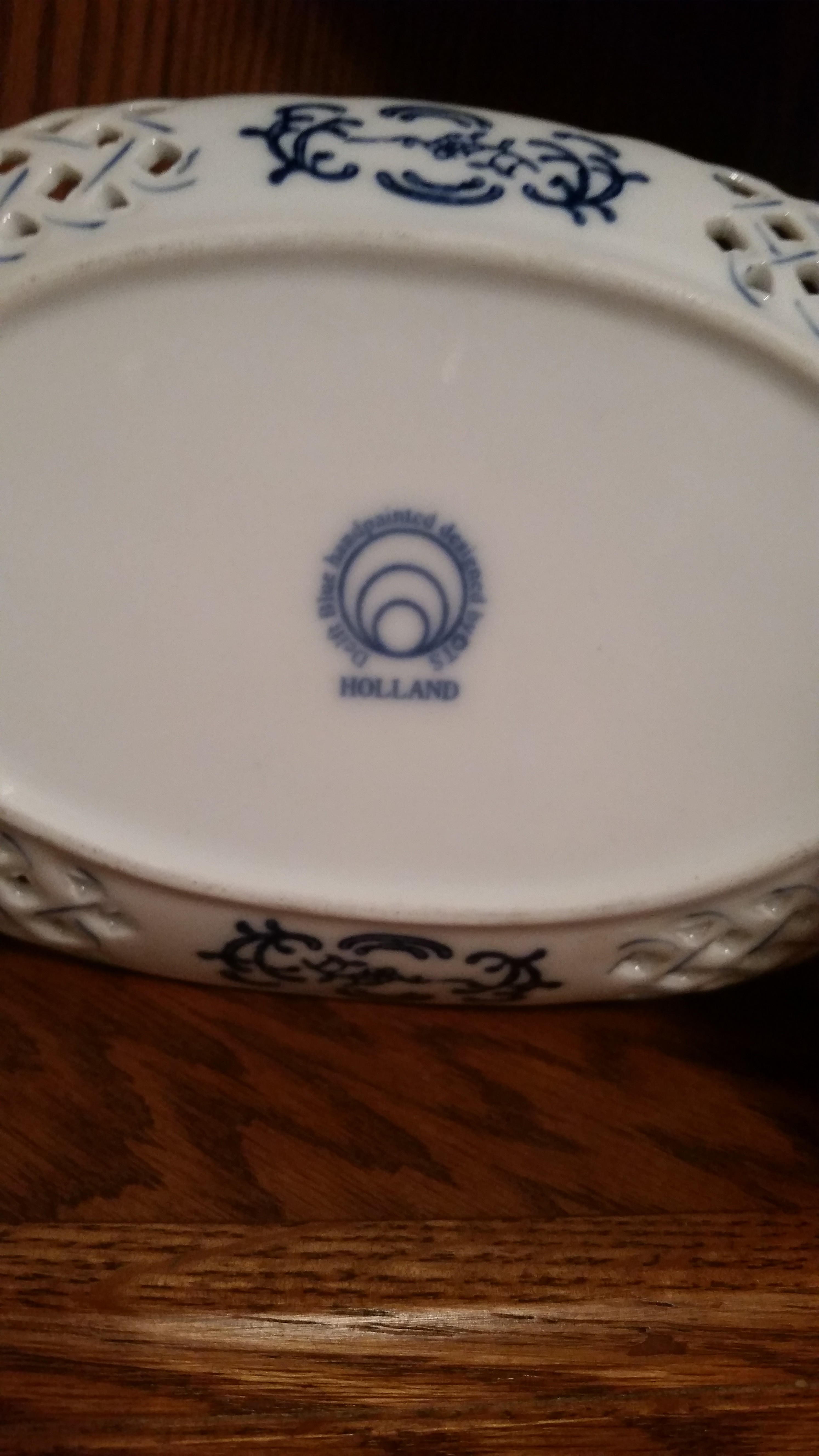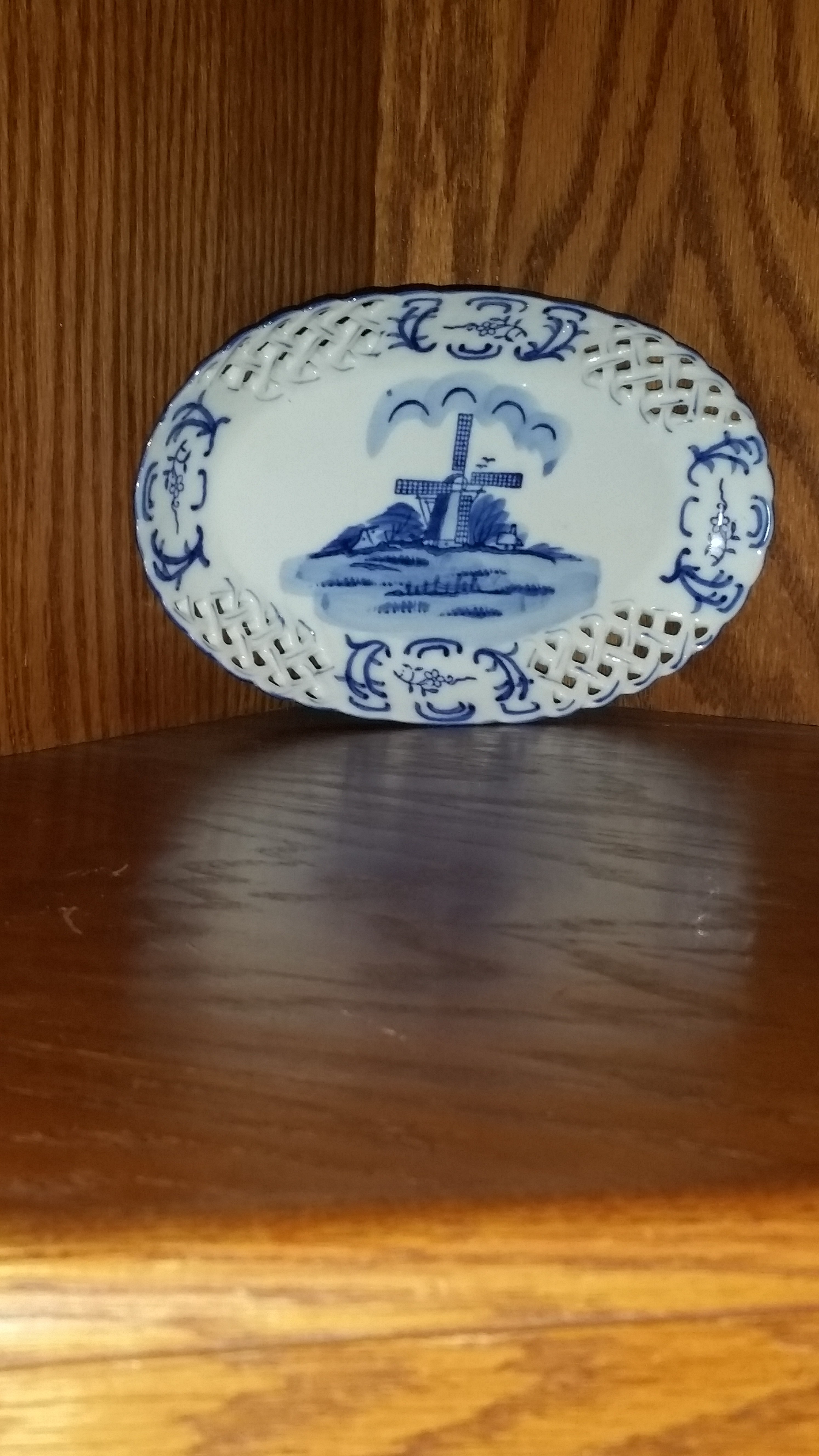 I'm cleaning house and trying to decide what is worth keeping, selling or tossing of the things I've accumulated through the years. This piece is an oval like plate or platter with a picture of a windmill. On the back is printed "Delft Blue handpainted designed by OTS". The word "HOLLAND' is printed underneath that