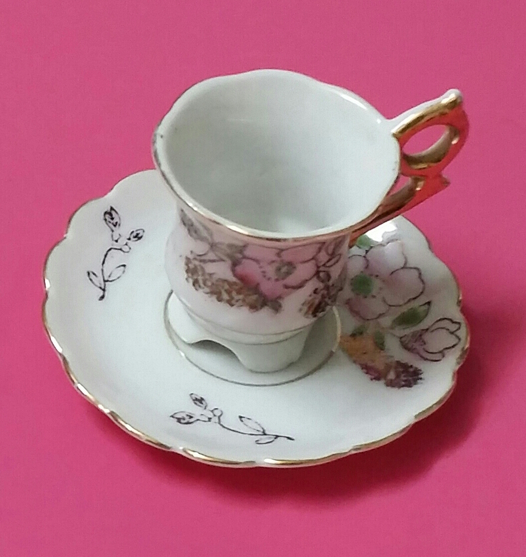 Demitasse footed cup with saucer. Beautiful purple flowered print (name unknown).