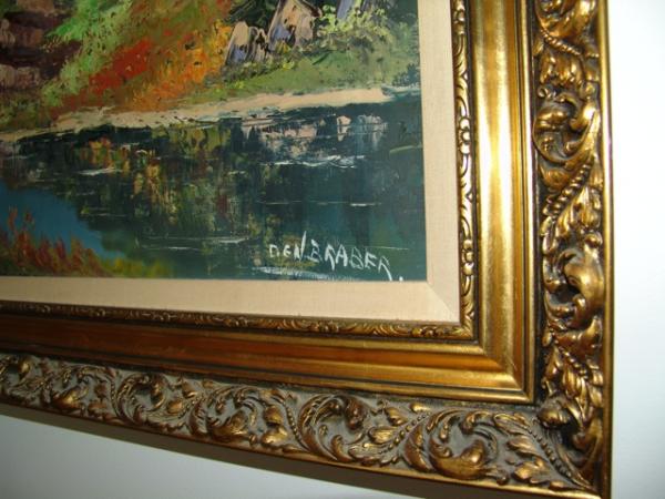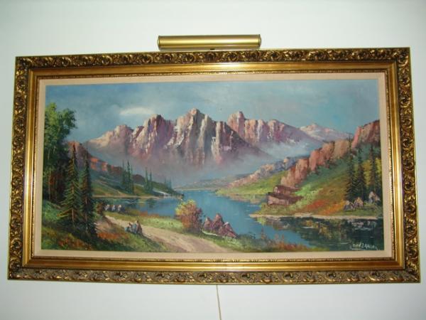 This is a painting purchased in Los Altos, CA in a estate sale in 1999 for $50 (as we recall). Its nicely framed and has a light that perhaps came with the frame. However, the painting is slightly damaged - one crack above the mountain which has been fixed by someone and the other is not fixed. Both these points are shown in the photo. The condition could be Good or Fair or even Poor depending upon the choice.