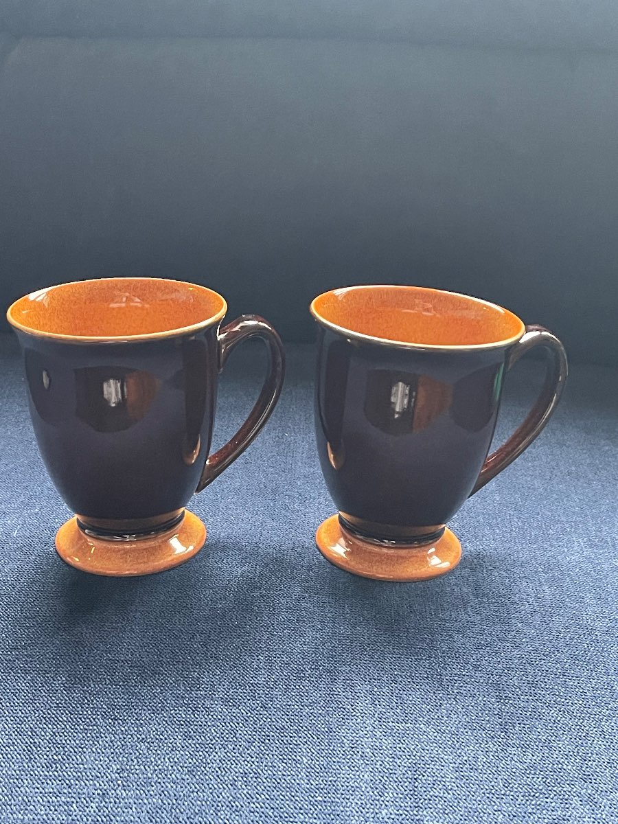 The mugs are identified as being made by Denby Pottery, a renowned British pottery manufacturer founded in 1806. Denby is known for its high-quality stoneware and distinctive glazes. The company has a long history of producing functional yet aesthetically pleasing pottery, making it highly collectible.