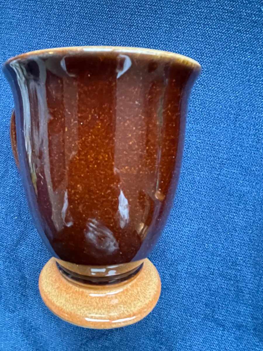 Physical Description: This appraisal covers a pair of vintage stoneware mugs. Each mug features a rich, glossy brown glaze with a contrasting orange interior. The mugs have a classic shape with a rounded body, a flared base, and a comfortable handle. The dimensions are approximately 4.5 inches in height and 3.5 inches in diameter at the rim. The base of each mug is marked with a stamp indicating the maker.