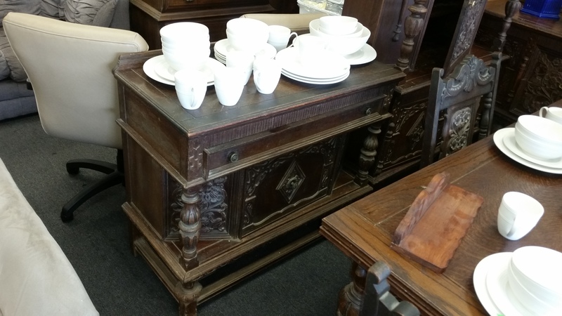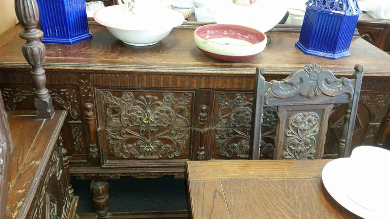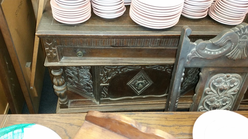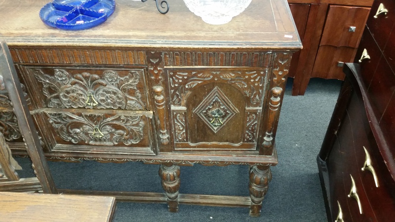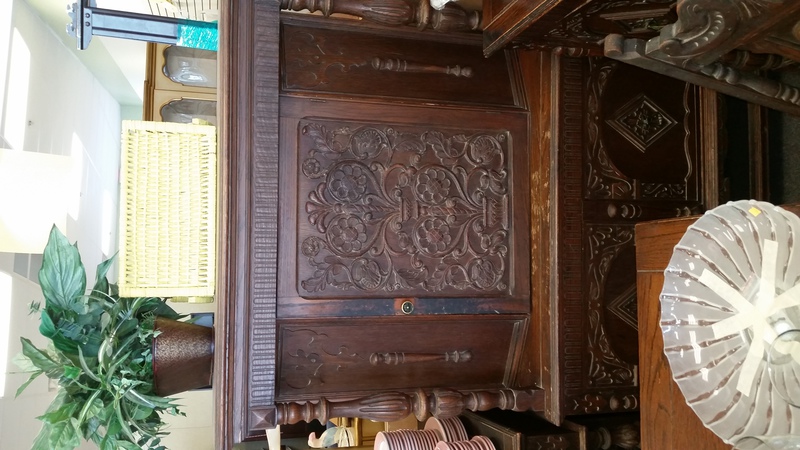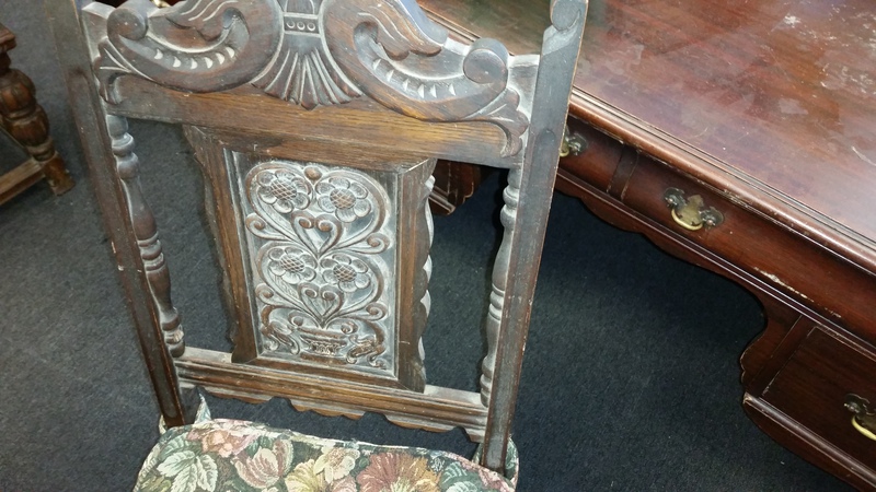 I found this at a local thrift store for $700.00. There are a total of 8 pieces including the 4 chairs. I was hoping to clean it up and use it at home. It only has 4 chairs and they need some work, but it is in mostly good condition. There are some pieces of trim that are missing, but they are all in an interior drawer from what I could tell. Anyway, was I right in guessing depression era? is $700.00 too high? My other concern is my complete lack of skill in repairing, refinishing furniture. I want to try, but the small carvings are going to be a pain in the butt. I think it would look good with a dark stain.