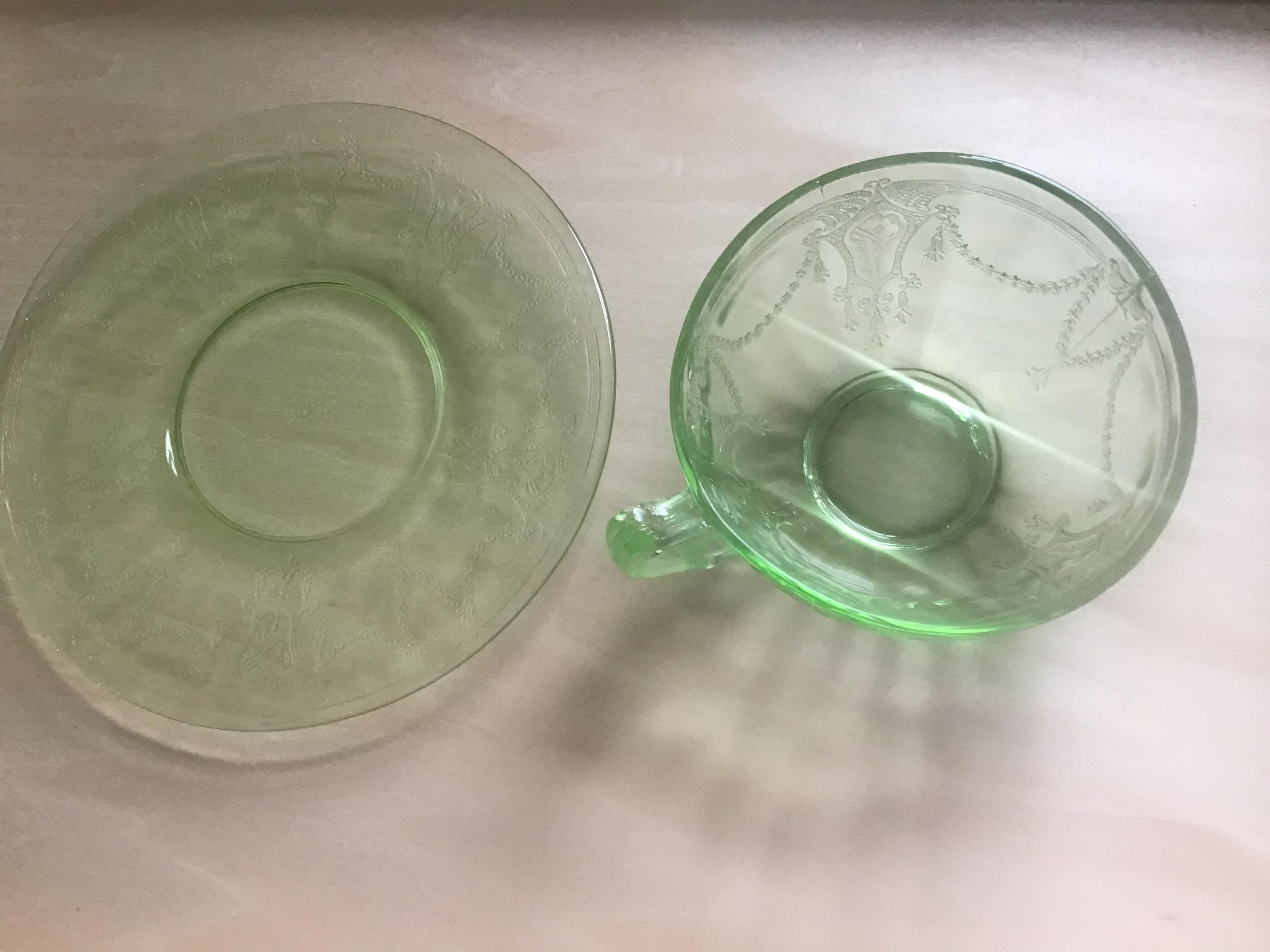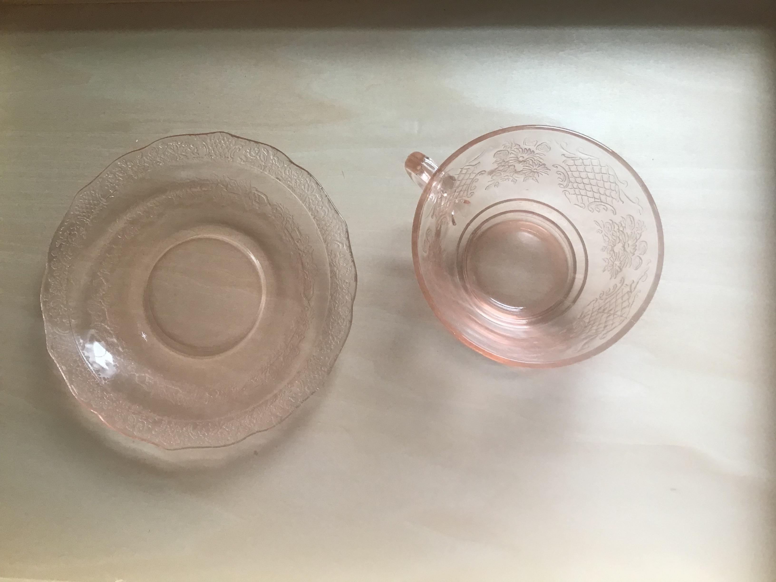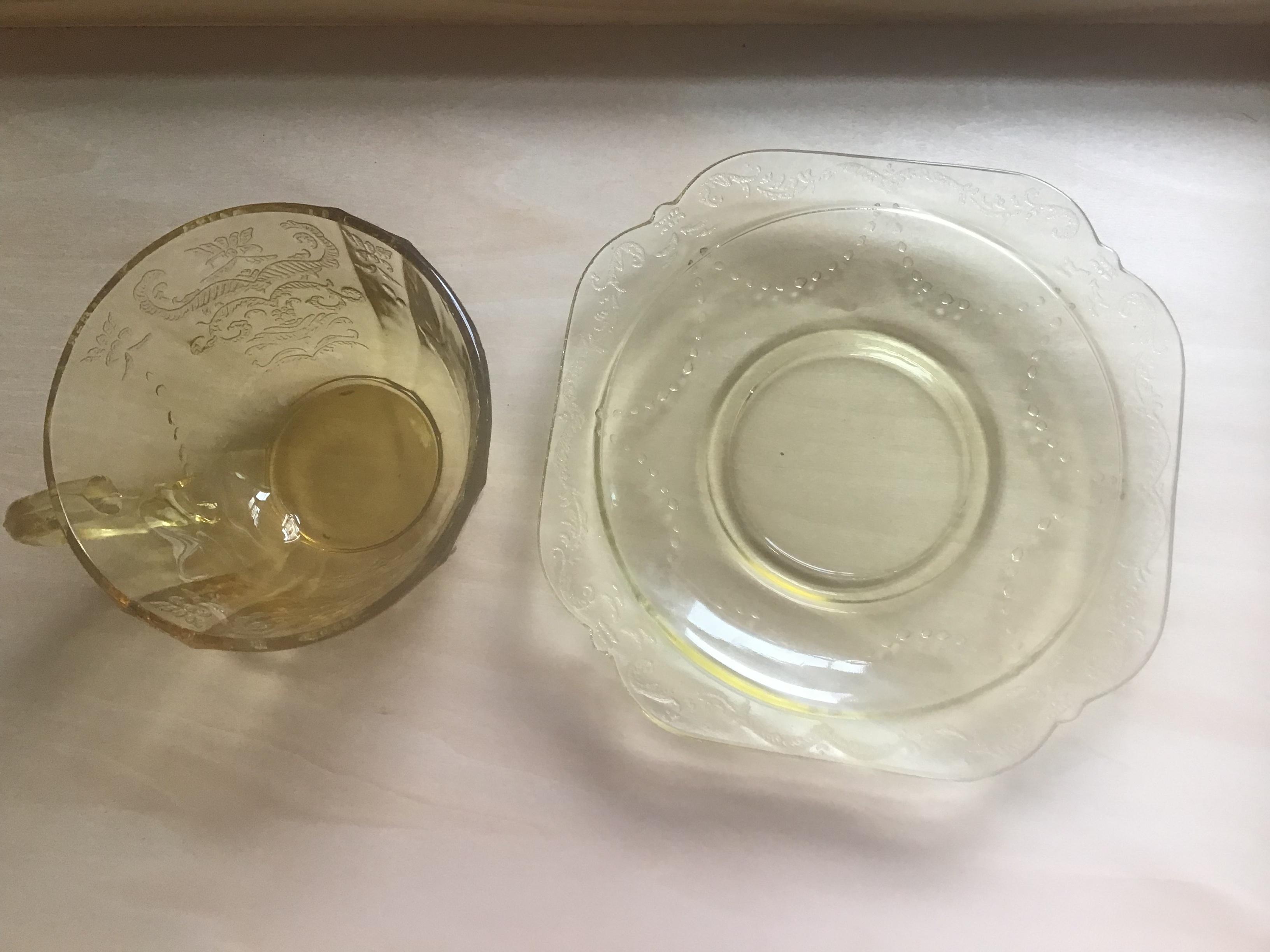 I picked up this gorgeous glass at a flea market. I am wondering if it is real depression era glass or reproduction. I am pretty sure the green, pink, and yellow are real because they have straw lines, bubbles, and yellow has some chips in edge. The blue has bubbles but seems too thick to be real? It also isn't brilliant cobalt blue, but lighter and I am not sure if this was a production color of the 30s and 40s. I also need to know what the patterns are on the blue, yellow, and pink. I know the green is Cameo. Any idea what it is worth? I originally bought it to use but then found out depression glass is not safe to use due to arsenic, lead, cadmium and uranium. Thank you in advance!