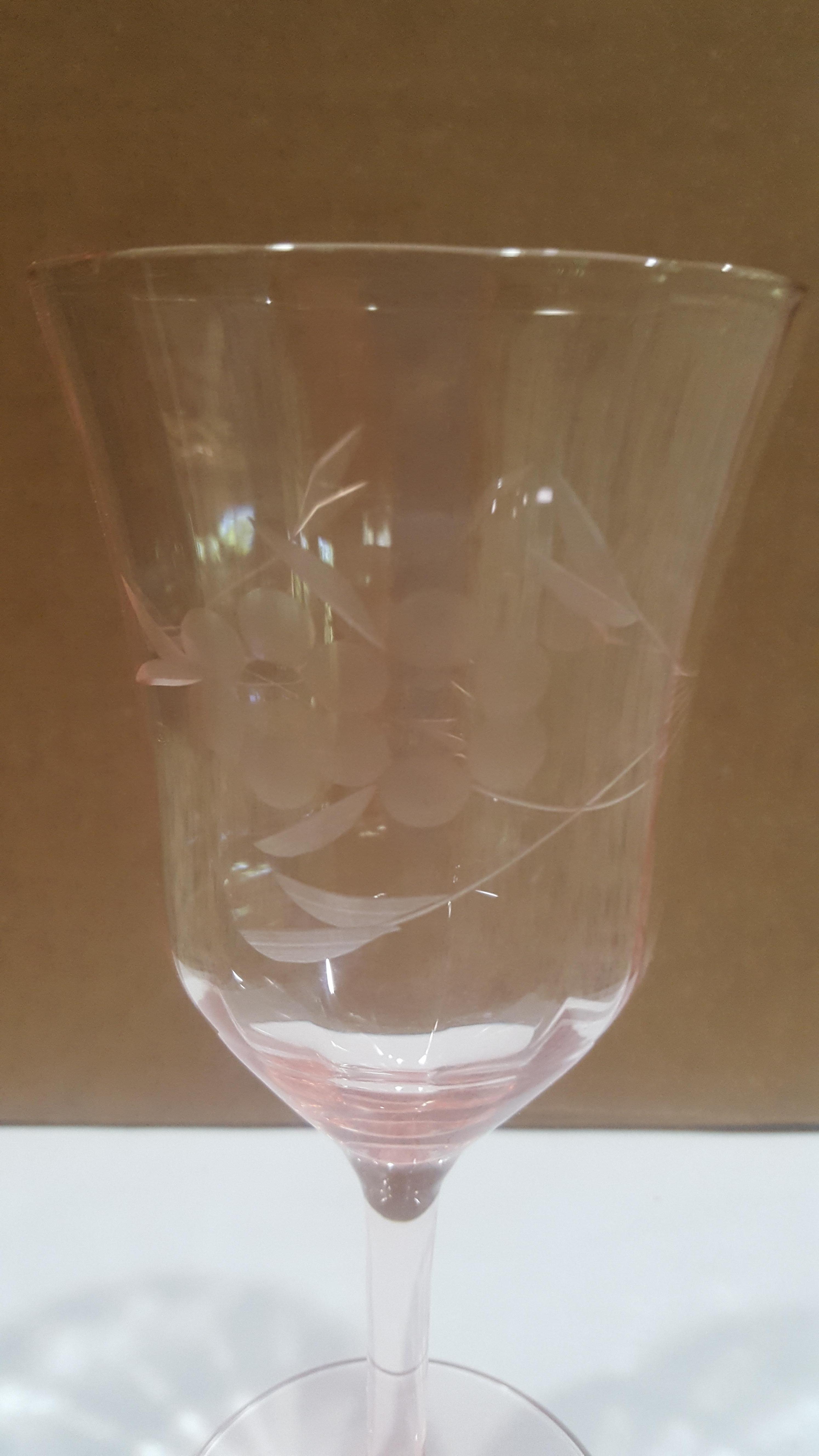 Set of 6 Depression Era pink wine glasses with flower teching. In very good condition.