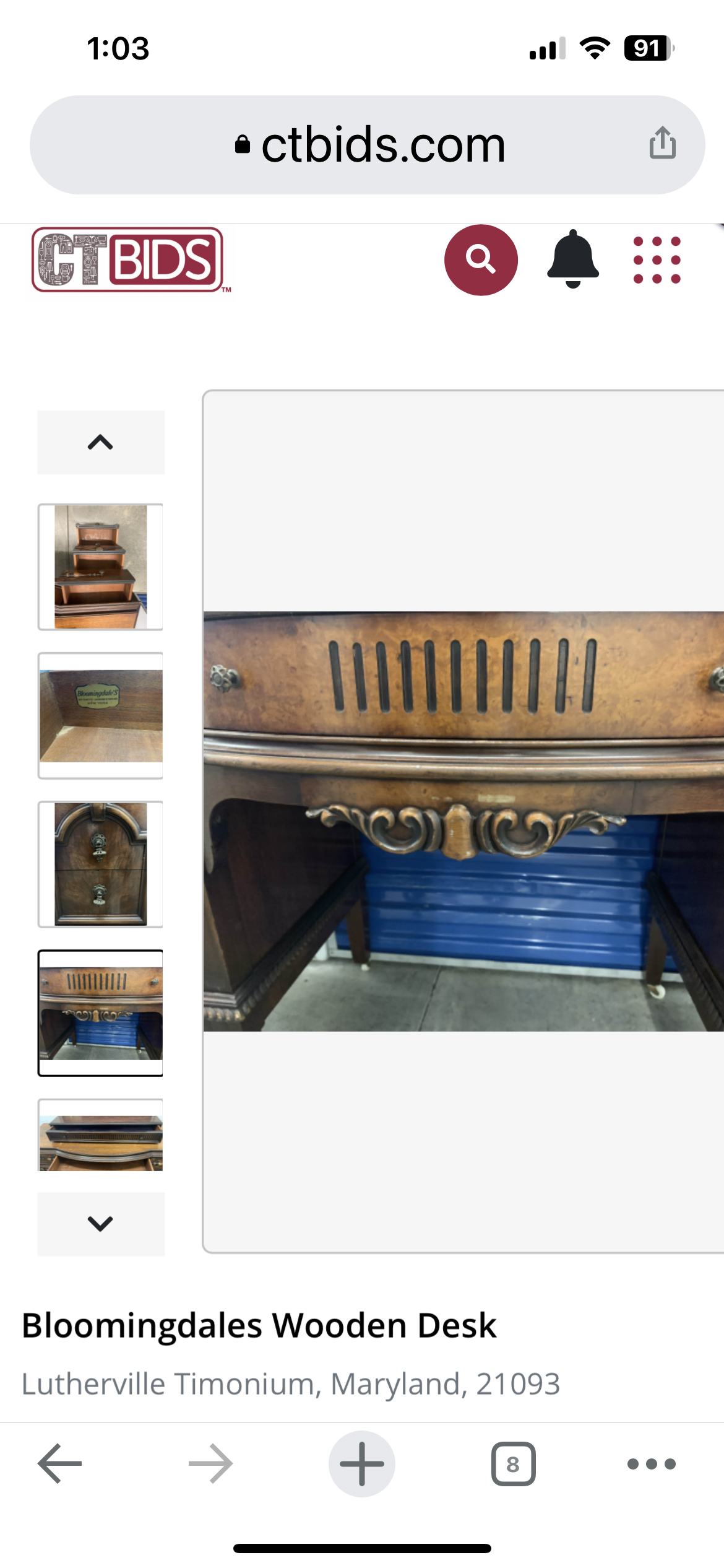 Beautiful antique ornate wooden desk by Bloomingdales. In very good antique condition with some wear and tear from use. There are wheels on all 4 legs, making this easy to move. 36"x 53"x 20