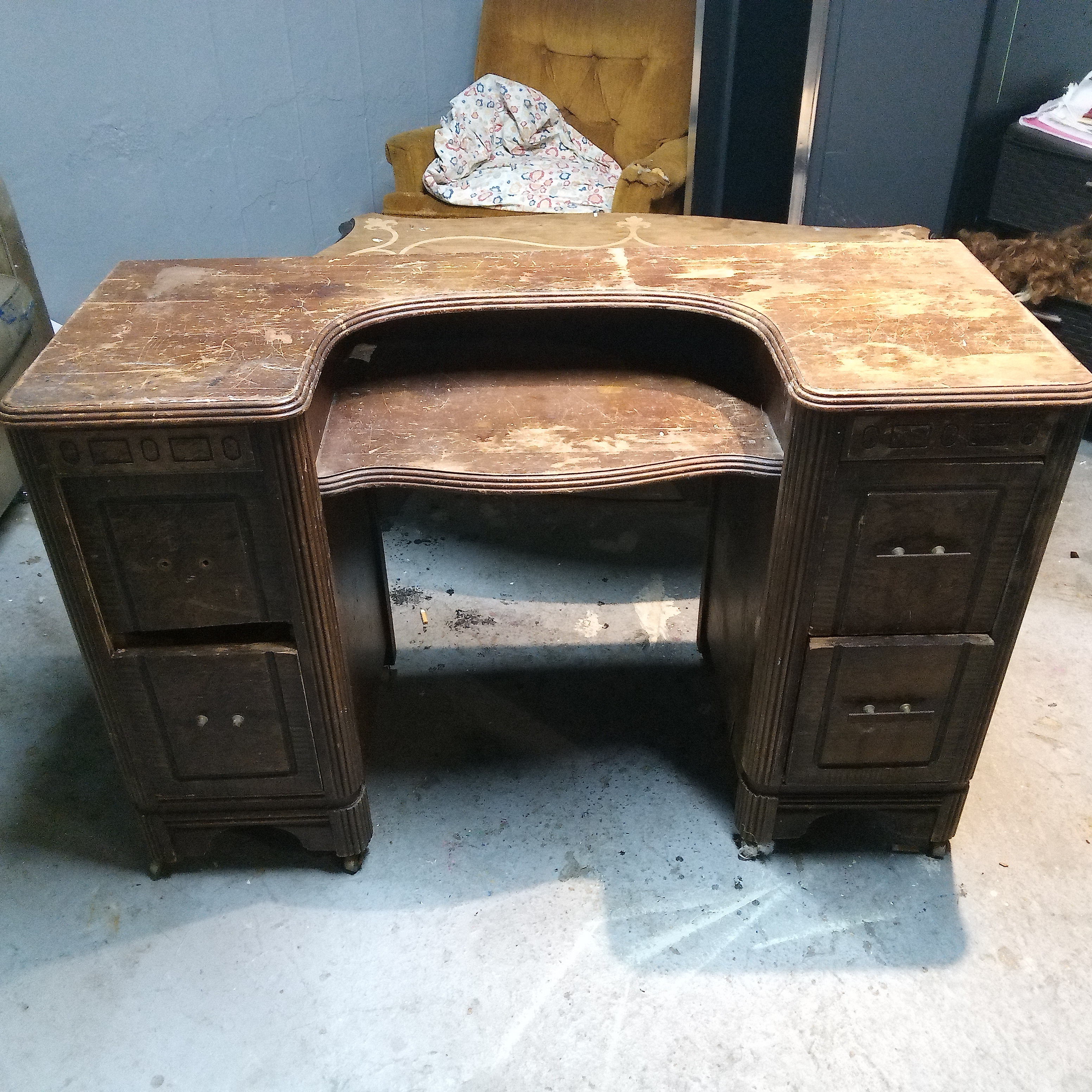 This desk is a vintage wooden piece featuring an elegant curved design. It has four drawers on the sides, indicating its use as a functional writing desk or vanity. Its style and craftsmanship suggest that it was likely made in the early-to-mid 20th century, potentially around the 1930s or 1940s. The presence of veneer and the design details align with Art Deco or early transitional styles, common in furniture manufacturing of that period.