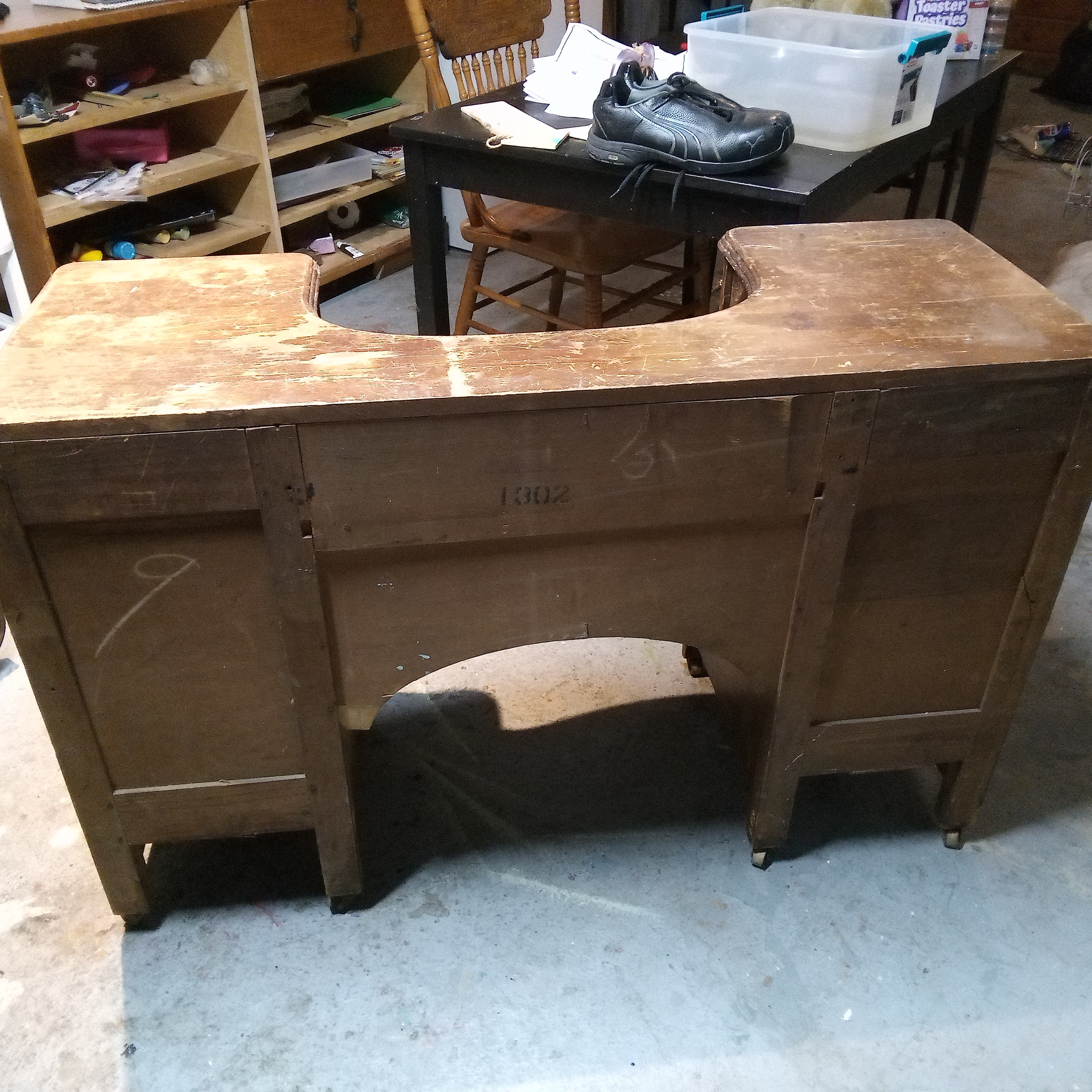 This desk's design places it in the early 20th century when furniture began shifting from the ornate Victorian styles to more streamlined, functional designs. The curved top and fluted details suggest it might have been a vanity repurposed as a desk or a compact writing desk for a bedroom or study. These types of desks were often mass-produced but still built to last, making them popular heirloom pieces.