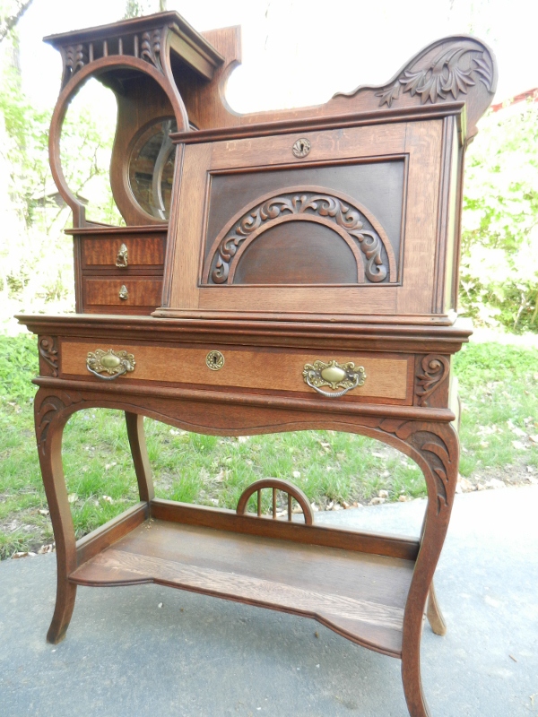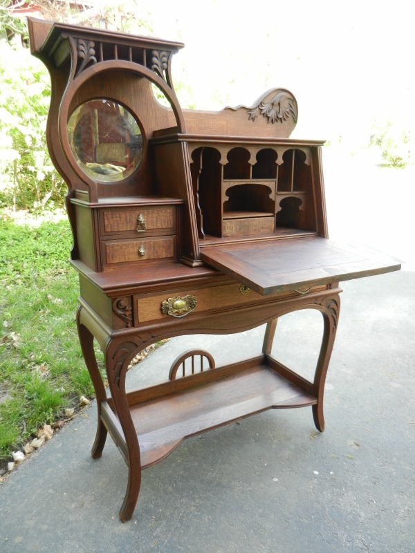 This oak secretary has a drop down desk with small compartments behind it.  It is unusual because it has a mirror attached.  There are some carvings of leaves.  My father just refinished it and replaced some pieces of wood that had been ruined.  He added hardware to it, as well.