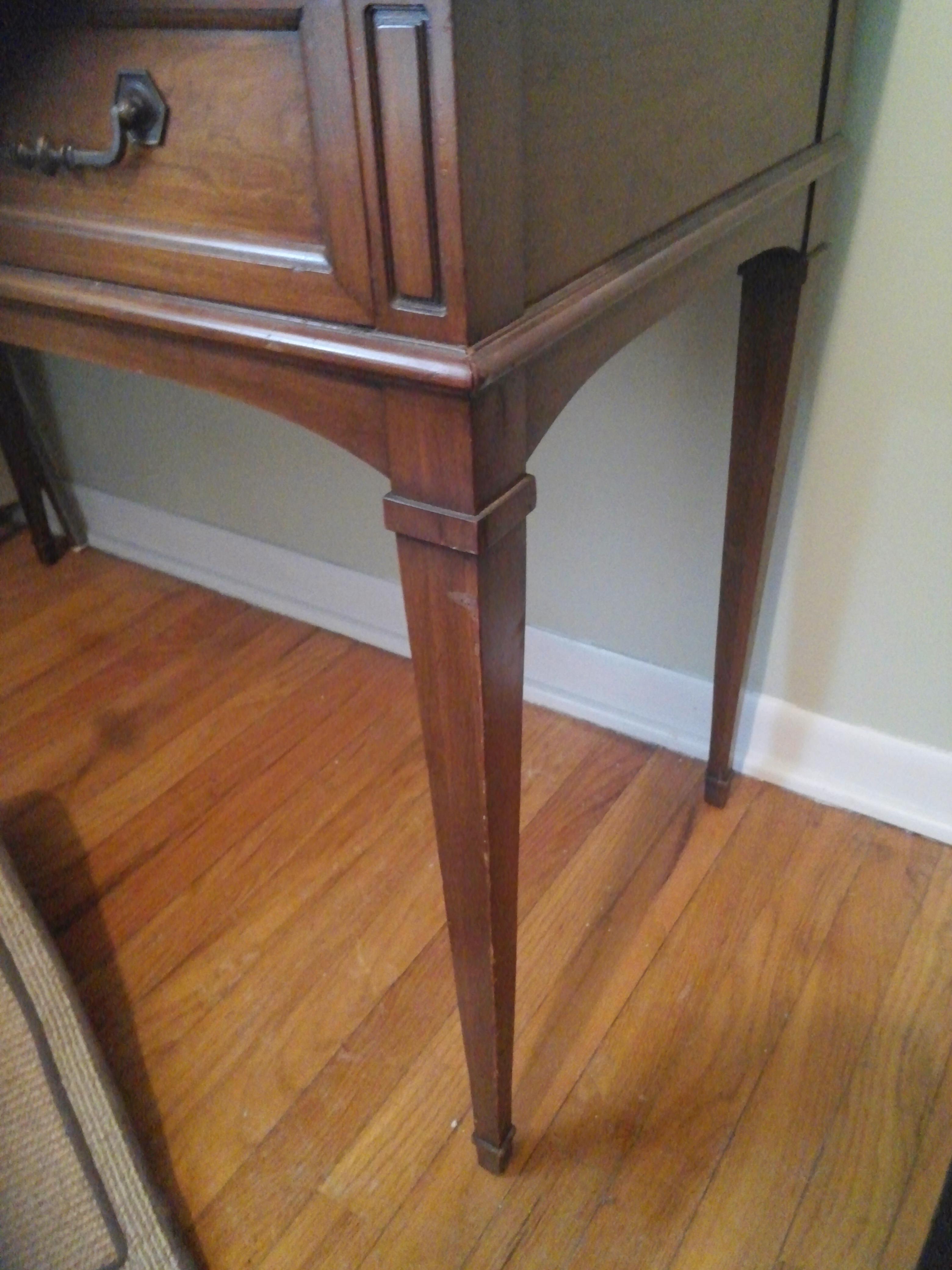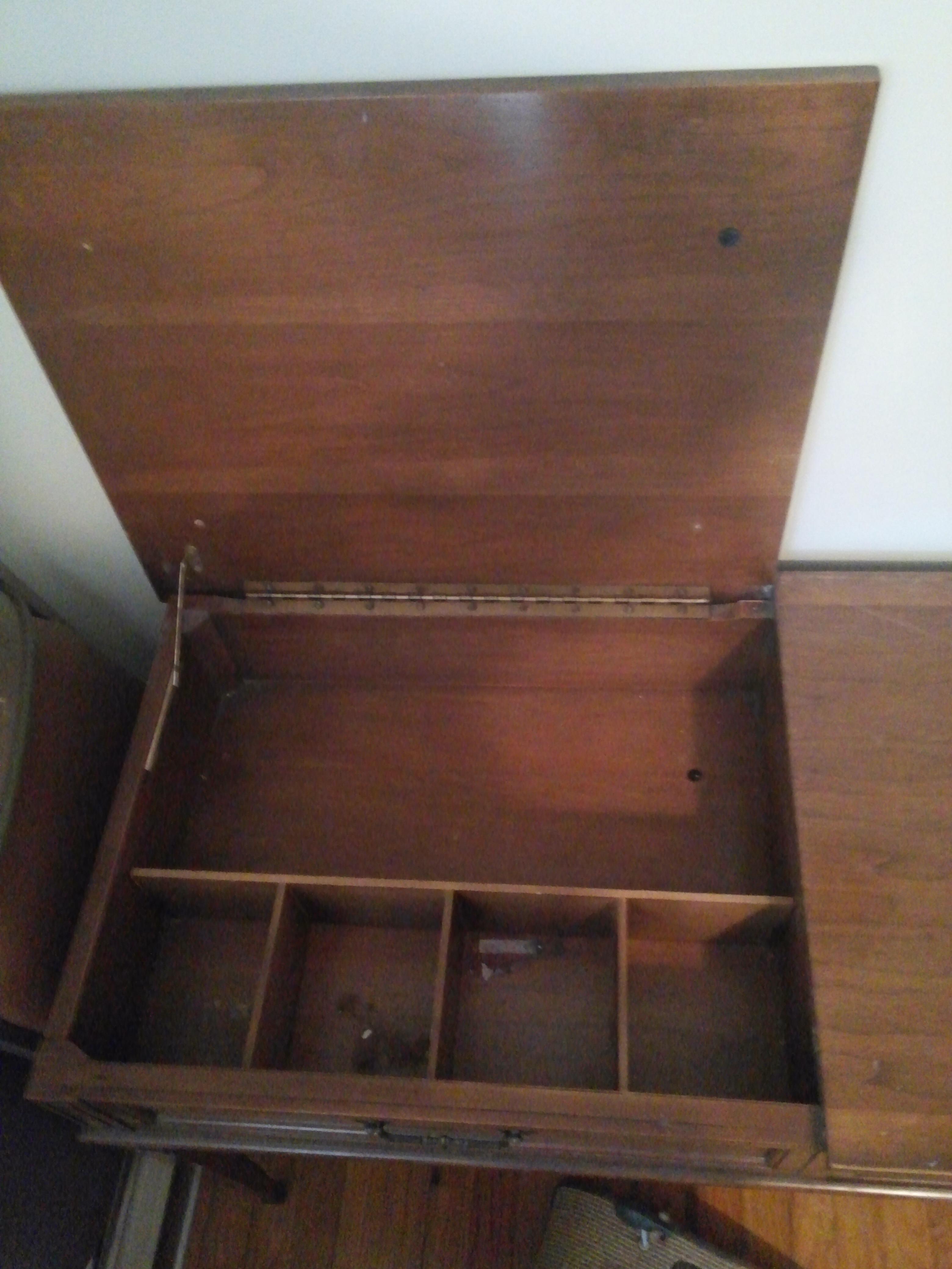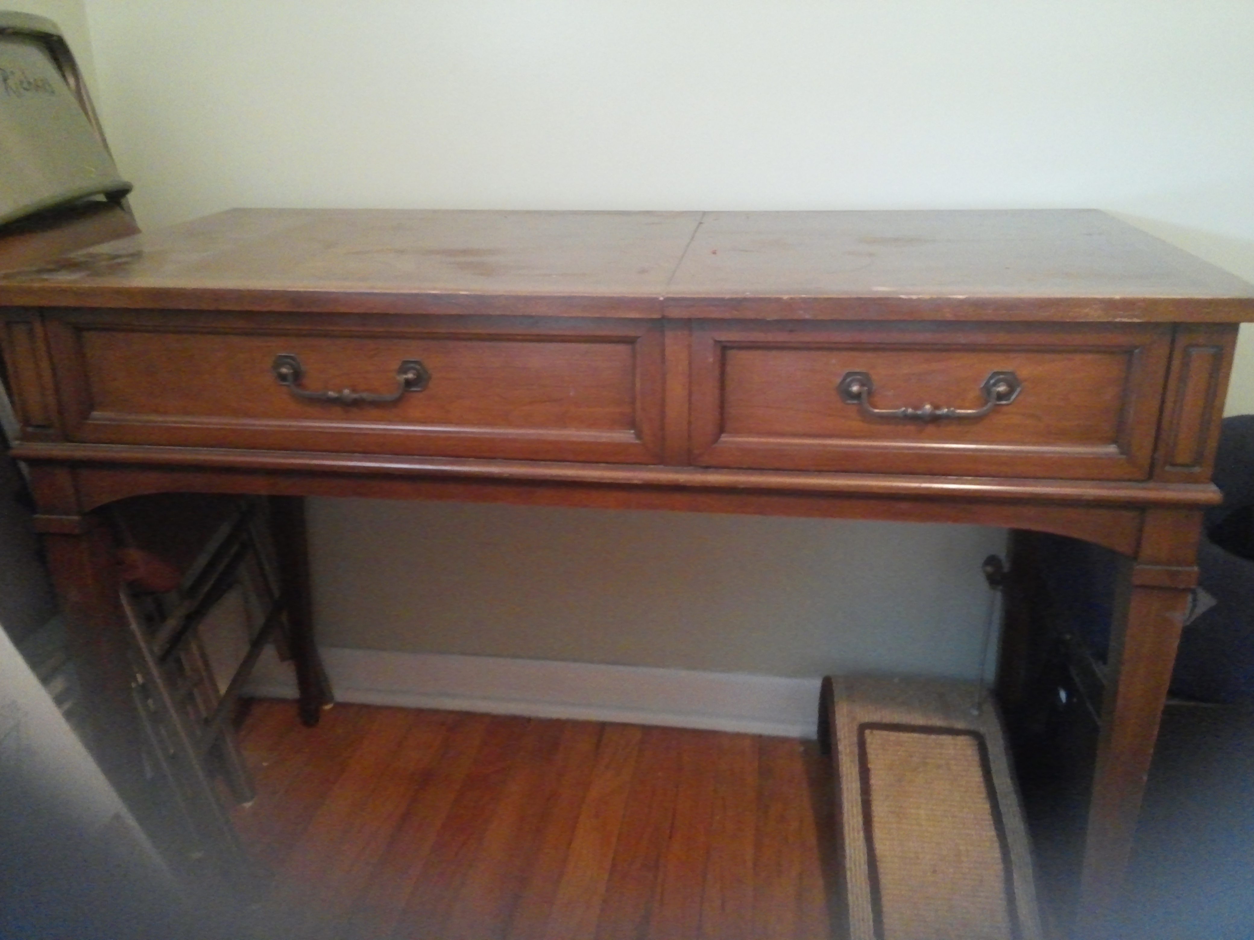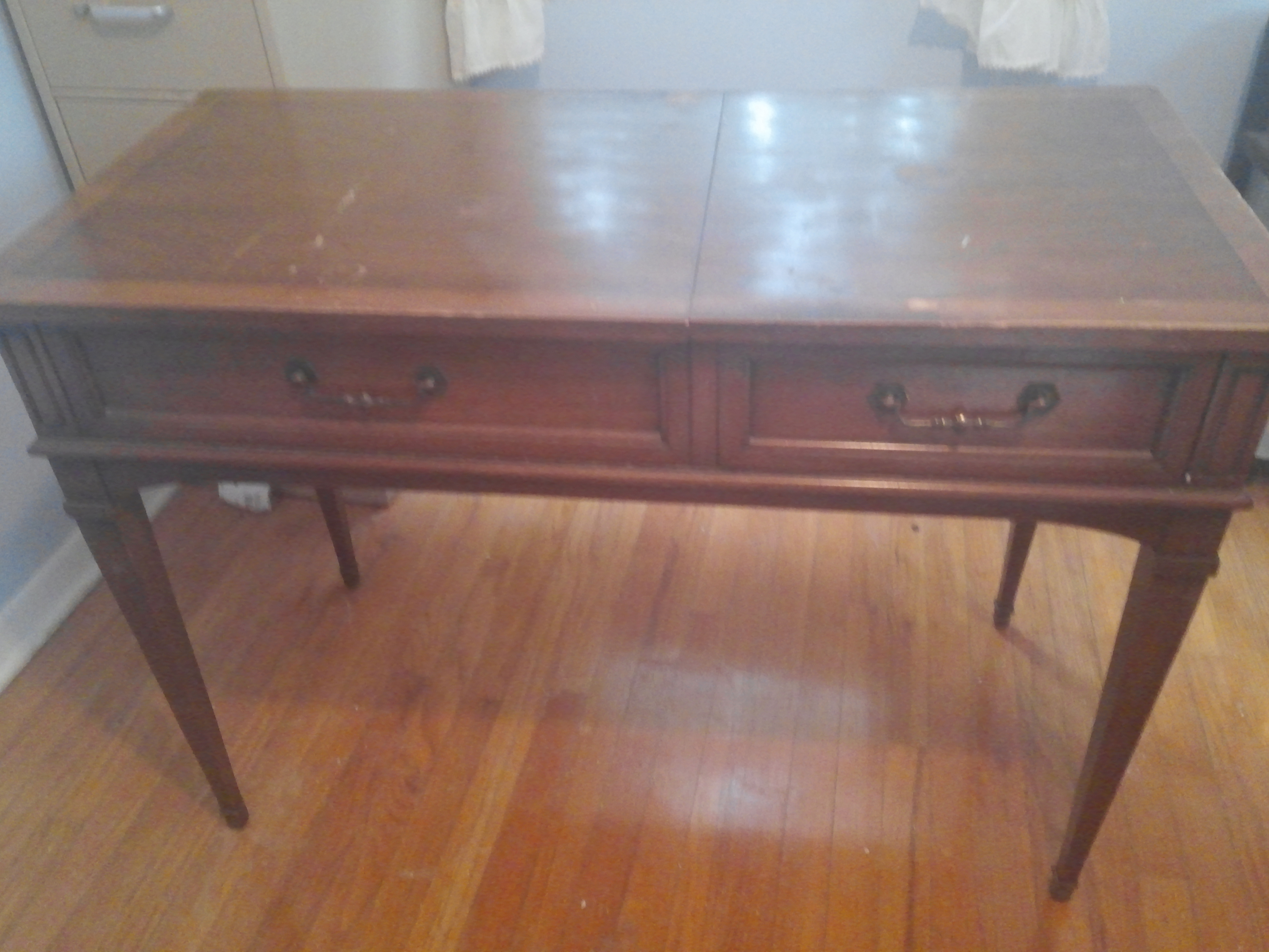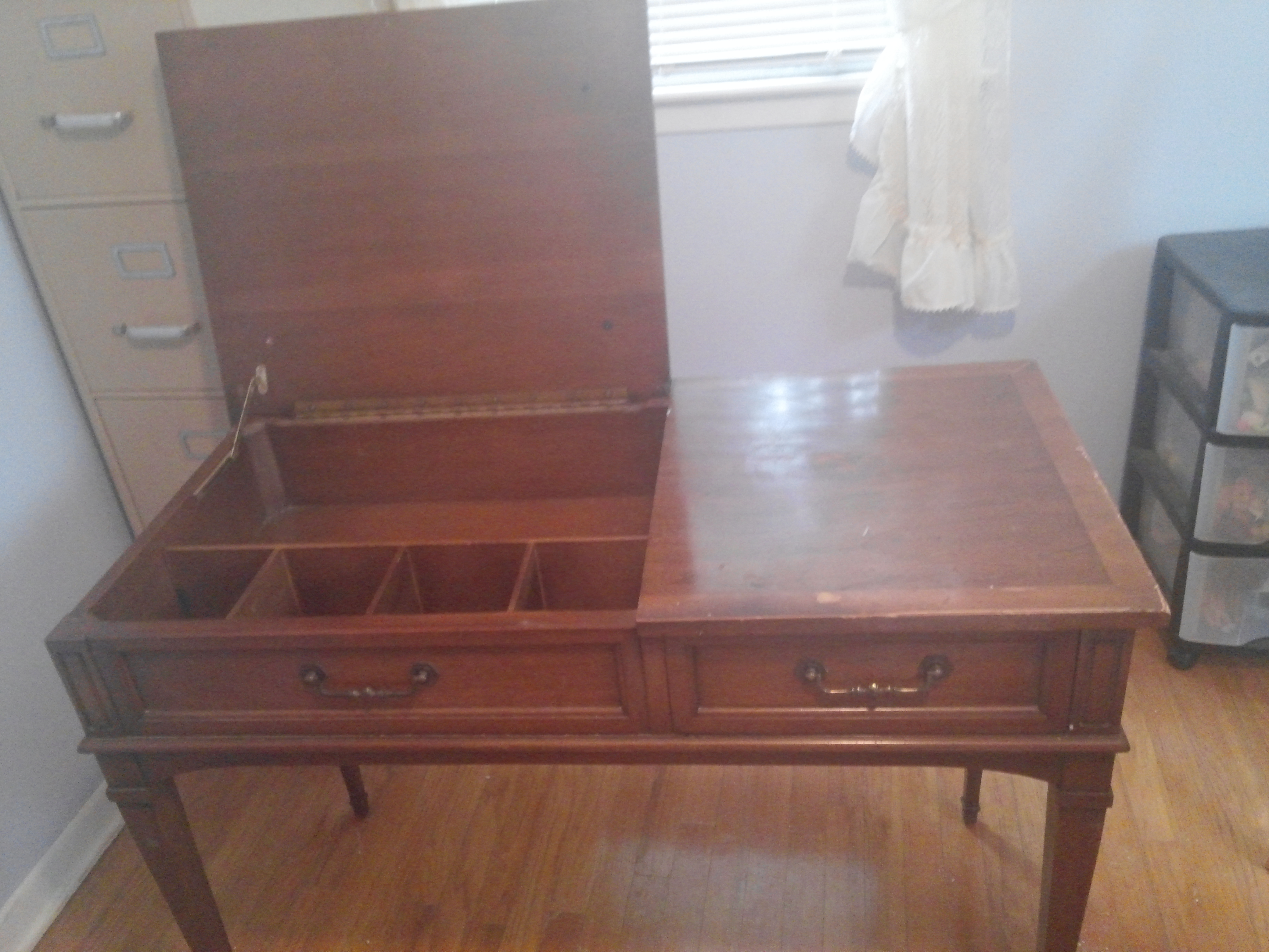 This is a vanity or desk made by National furniture Co in Mt Airy NC. It has an inlaid top. Left part of top lifts up. In side has compartments and under top should be a mirror. Mirror is missing. Right side has one drawer. Inside of drawer is the red markings National of Mt Airy NC. Any information, where to get information, or value would help me out greatly.