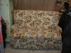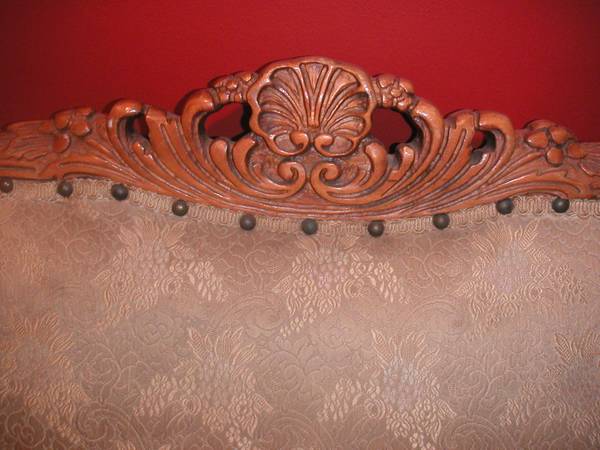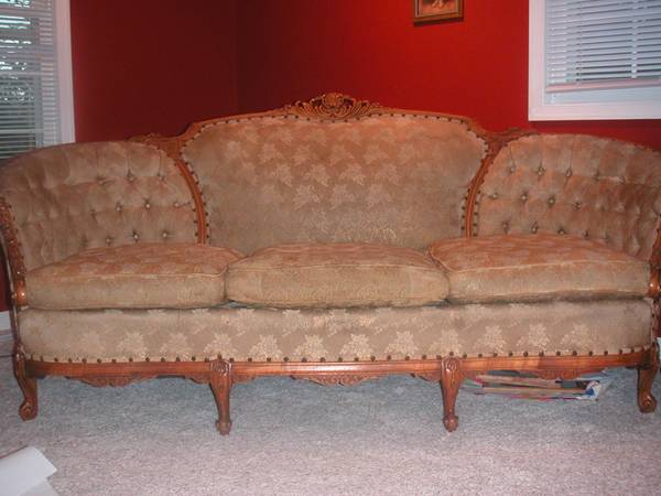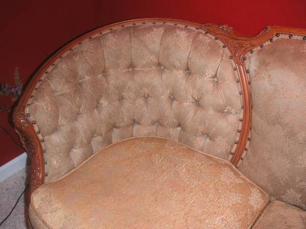 Sofa the photo's don't do it justice. I believe it had a shine to in the materials are still original and it is heavy even the cushins are heavier then what I expected.