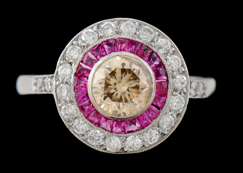 center round cut diamond, estimated at .71 carat, measuring 5.8 mm in VS2 clarity and champagne color, in an antique mounting, framed with twenty French cut rubies, and a halo of twenty-two round cut diamonds, estimated at .55 carat total weight, measuring 1.7 mm each in SI1-SI2 clarity and G-H color, and mounted in platinum with openwork filigree.