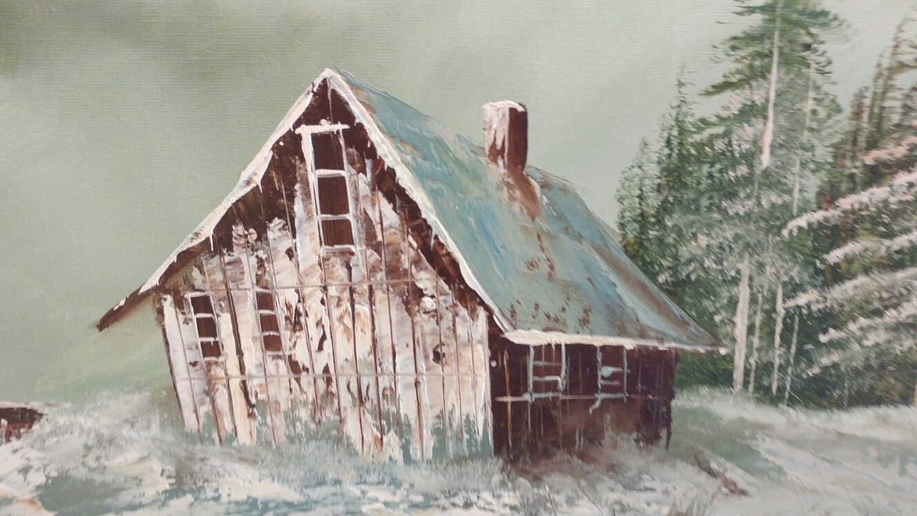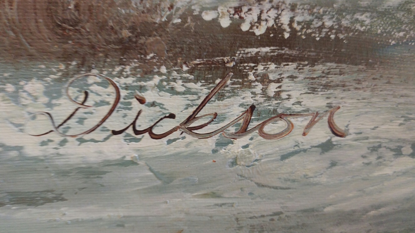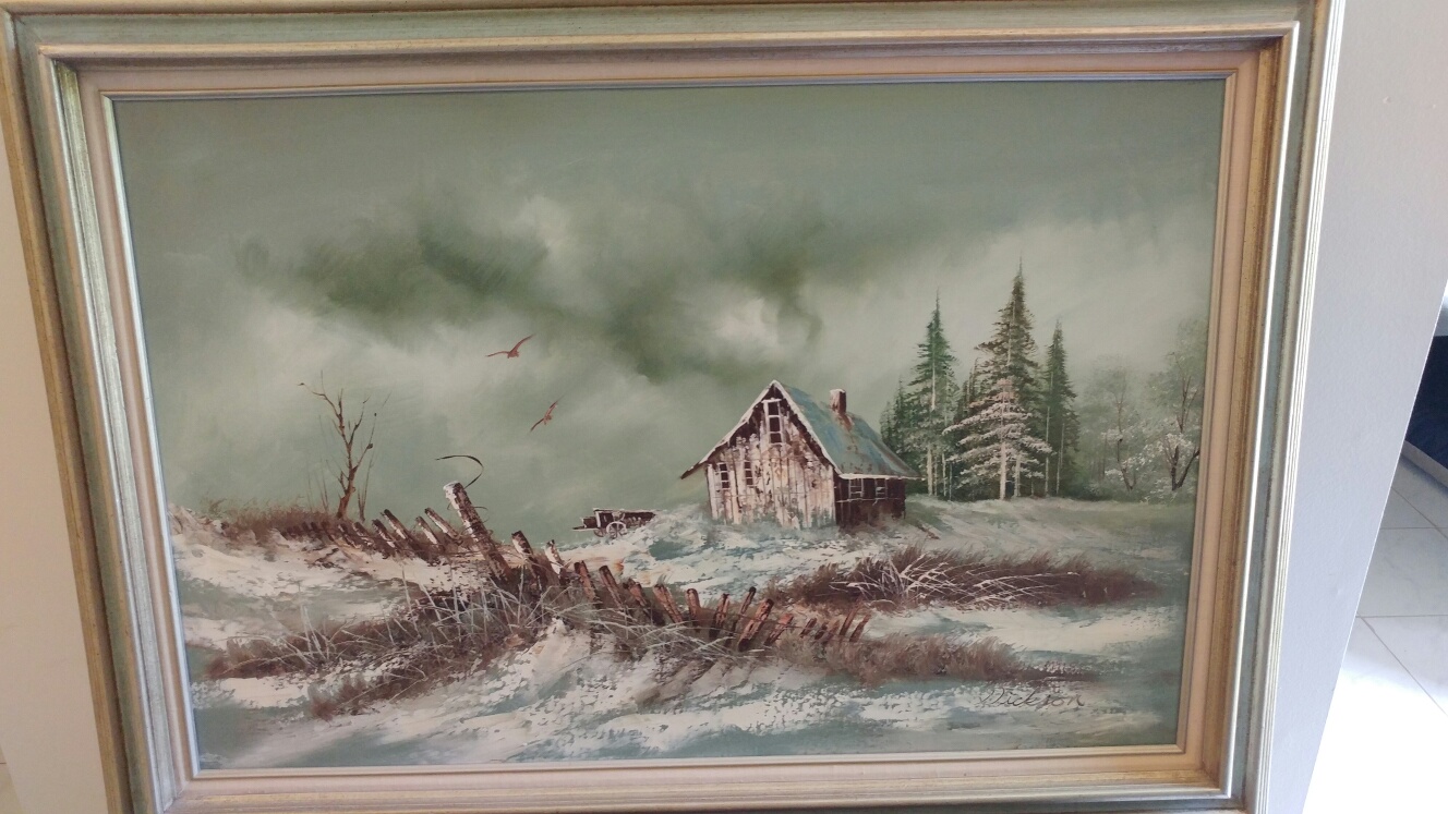 This is a Oil on Canvas painting by Dickson. Painting is of a old cabin/barn (one of his themes) with a fence and wagon. The painting is in excellent condition. The canvas is just over 24in high x35 in. Total size of framed picture is 31in high x41 in