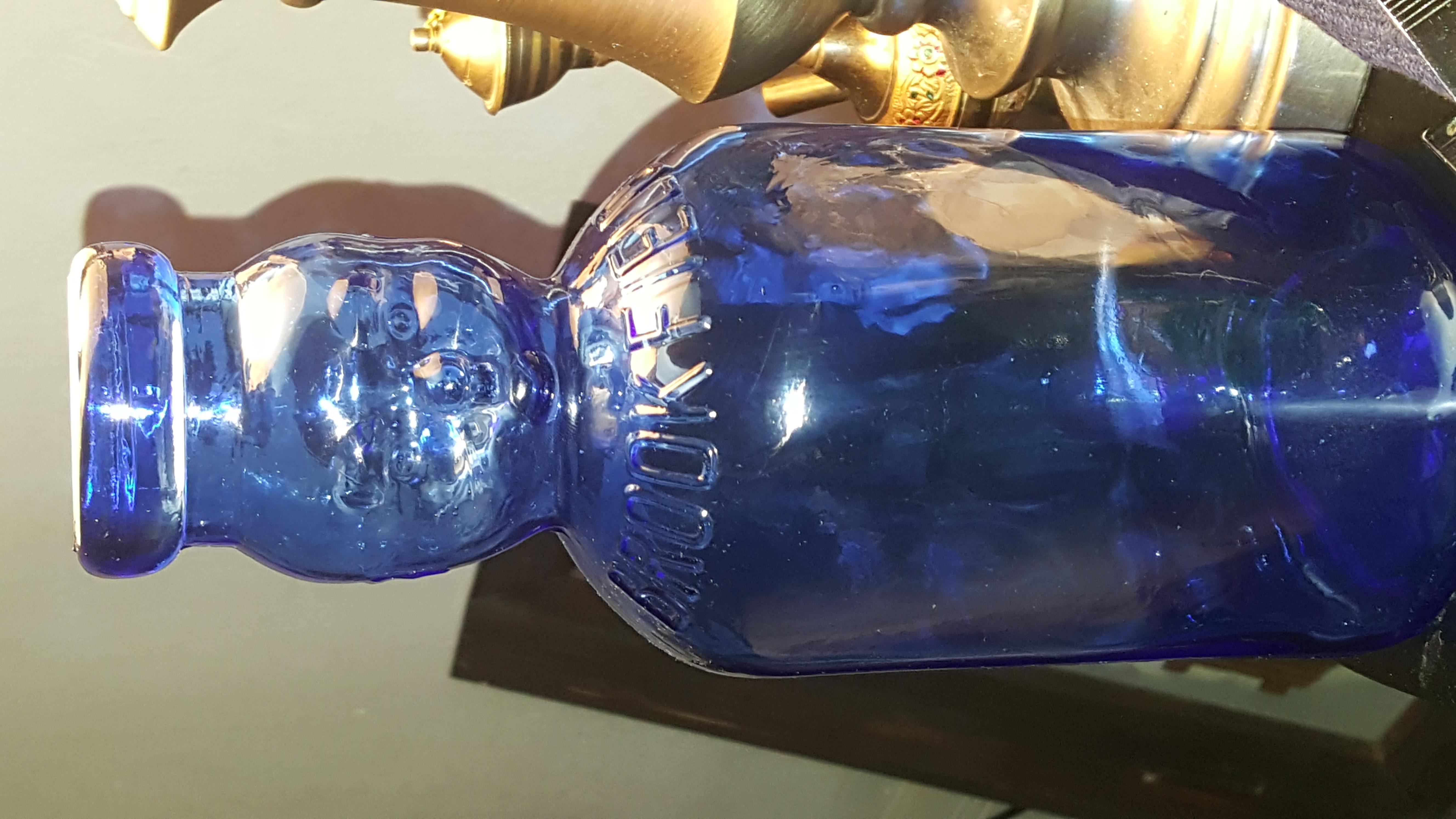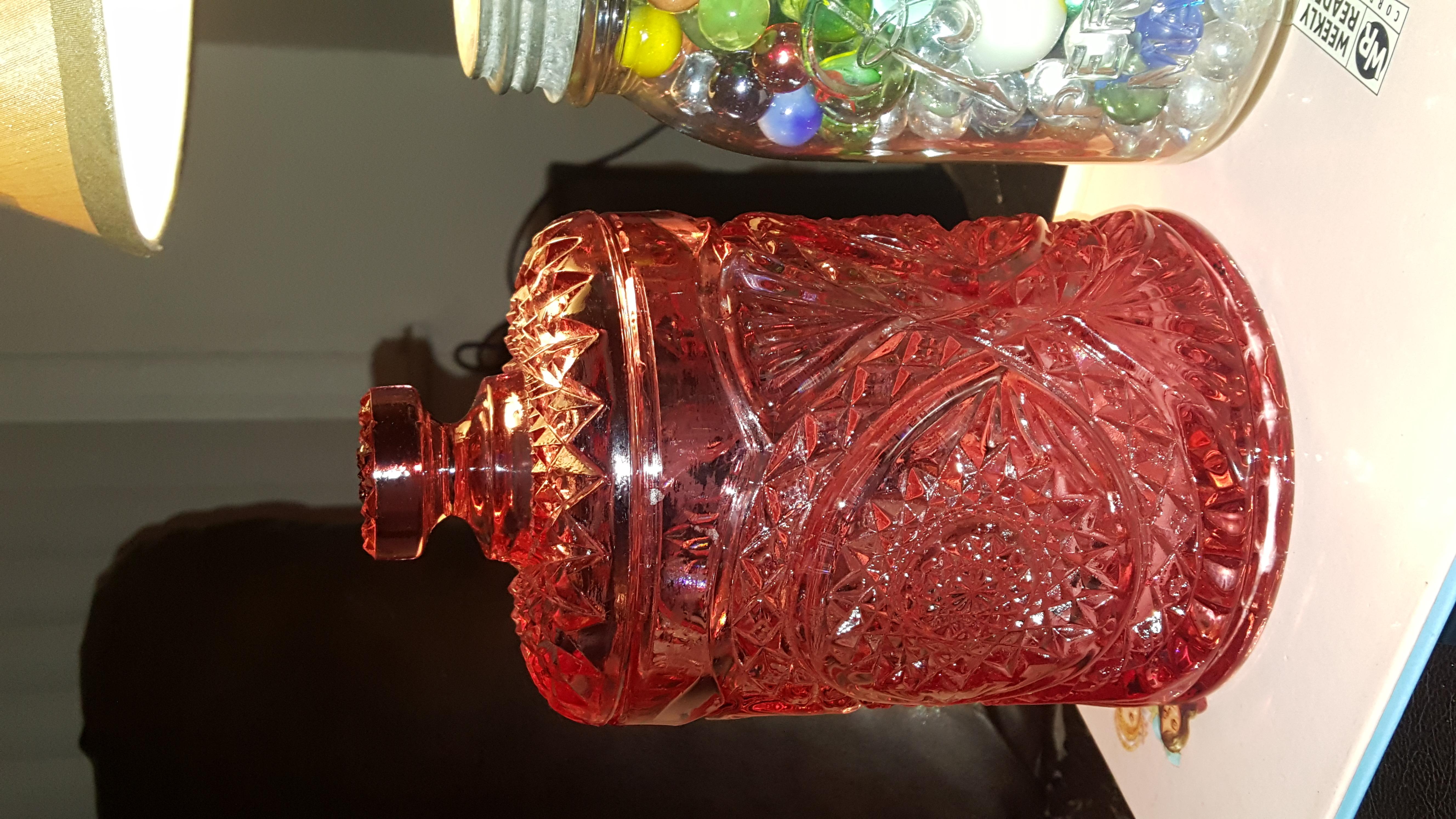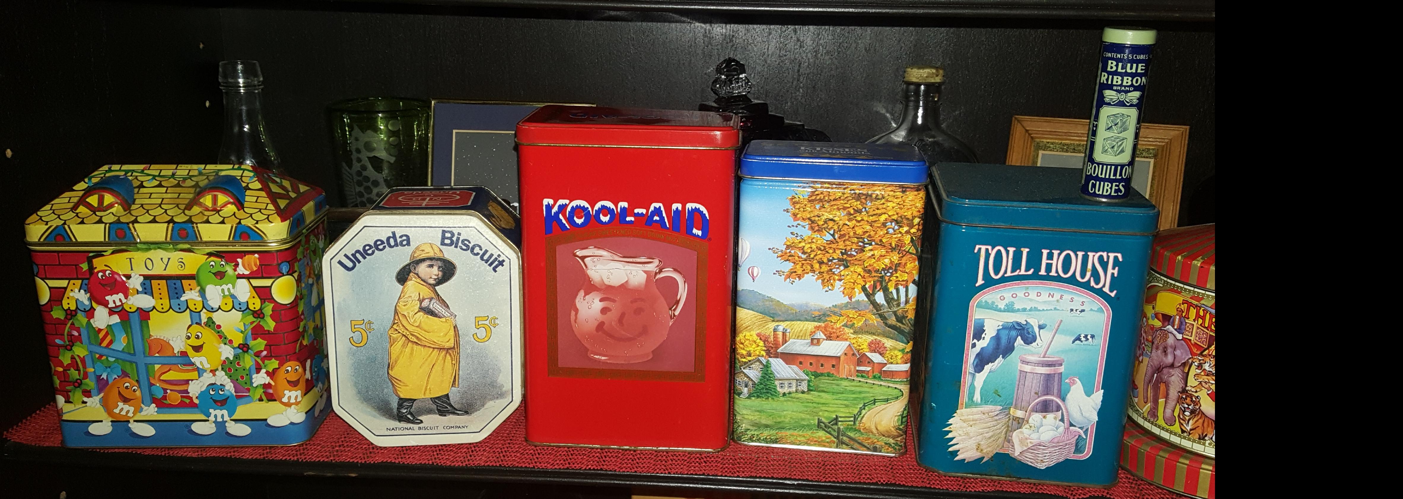 brookfield blue repro baby face milk bottle 5-10$ , blue itallian designer bottle 10-15$ , misc tins 3-5$ each u have a chance of the circus one and the m &ms one bringing 10 some times. biscuit on nice repro of old tin sometimes can get a little extra for it. dietz lamp 5-20$ . yu should list itms seperately take pictures of the bottoms and describe better for better appraisals like what if on th botom of the bowl (possably pirex)..its pyrex 20-60$ well they usuaaly bring 30-50$ if in mint condition. nice piece! might get 12-20$ for the jar of marbles. most the rest of the stuff looks like 5-15$ stuff. the pink candy container might be something it might be ealry pressed glass you should list it seperately and take pictures of the bottom and up close. i am not sure on this piece.