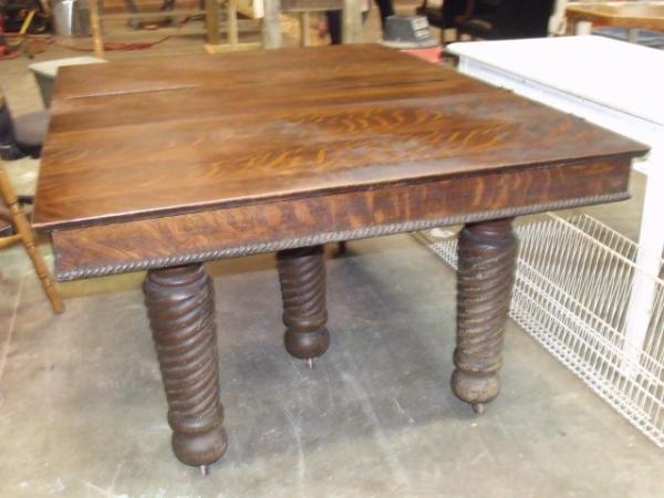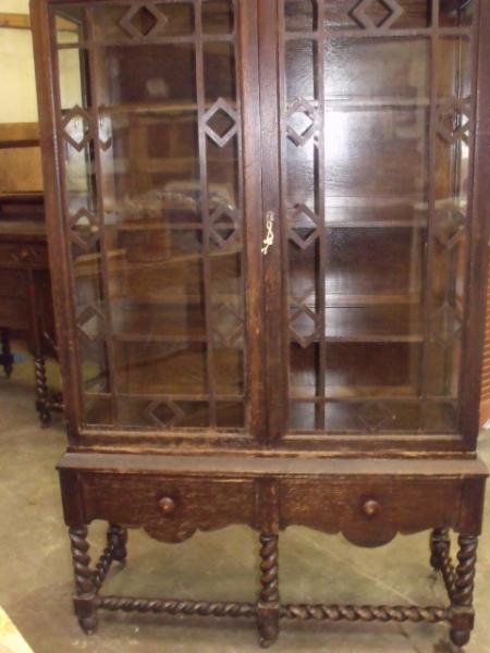 I have the china cabinet, buffet, dining table and 6 chairs. In the china cabinet, the glass is all intact. The shelves are in excellent shape. The legs are sturdy and the wood strips on the glass are all in good condition. The buffet is in very good condition with some finish worn away from the weather. But the wood looks very good. All drawers and doors open and close very well and keys are in the drawer. The table is 48 inches square without the two leaves. Table has 5 very fat legs that are scrolled. The chairs are hardly worth salvaging. They need to be refinished and recovered. I have not included a photo of them.