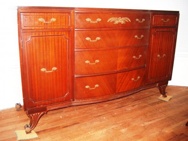 Dining room set including self-storing pedestal table with pads, four leaves, 2 arm chairs, 4 side chairs and buffet.  Very good condition.  All information is approximate.  More pictures upon request. Thanks for looking!