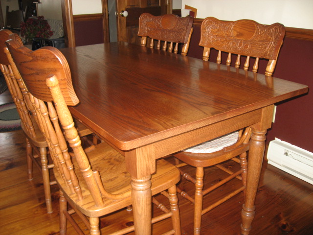 S Bent & Bros farmers table with draw and 4 acorn back chairs. Medium oak finish in execellent condition.