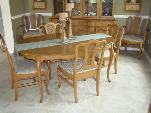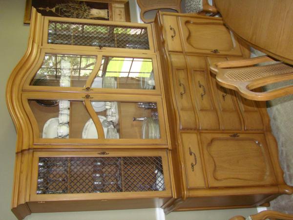 dining room table with 2 leaves is approximately 10 feet, china hutch with glass doors, buffet with side wings and wheels, table has 6 chairs