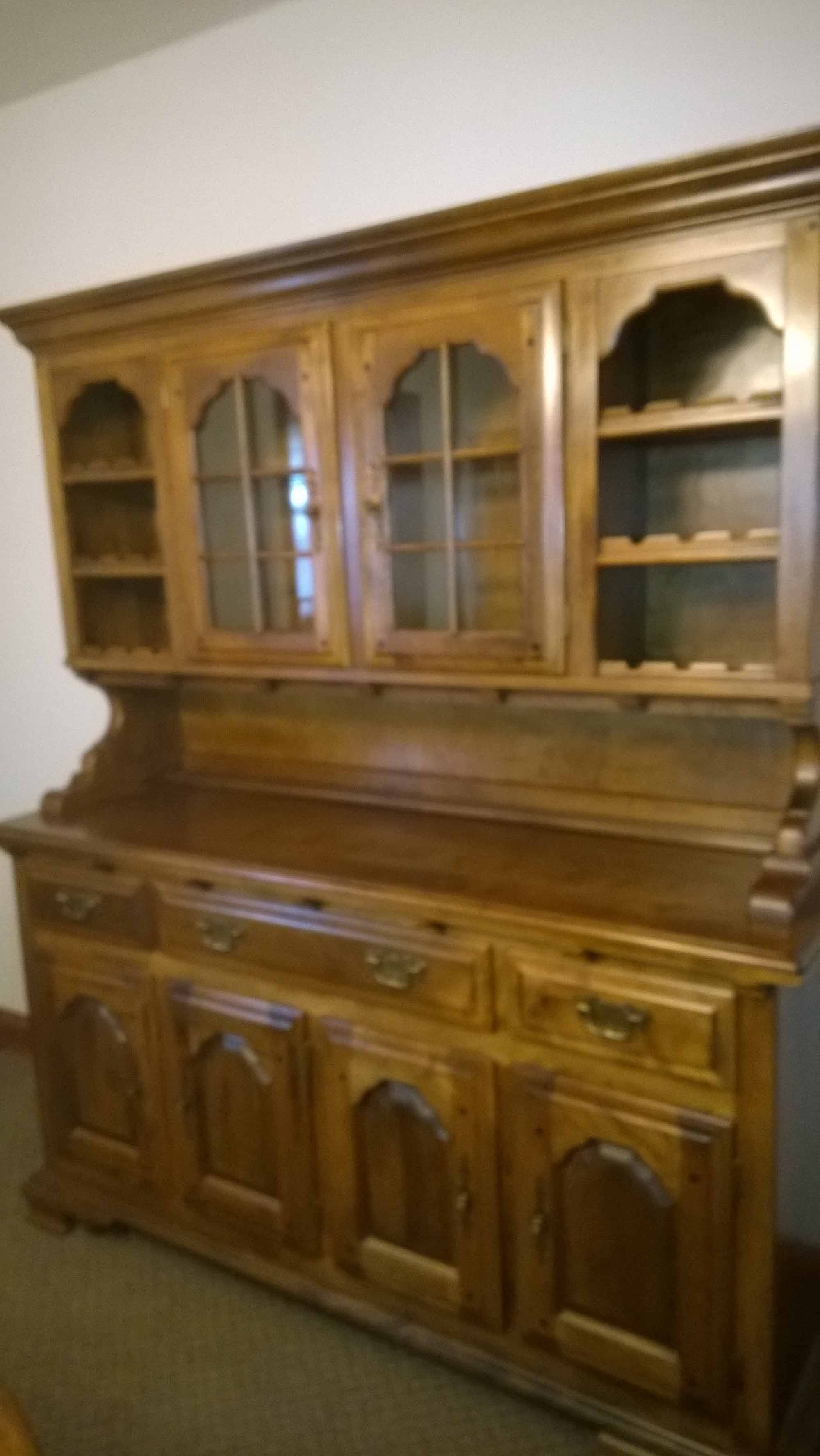 Eight piece dining room set by brand Temple Stuart. Model or style is called Rockingham. Set includes table with two leaves, 4 chairs, dry sink, corner china closet, and a hutch. Made of solid hard maple, in a dark honey type color.