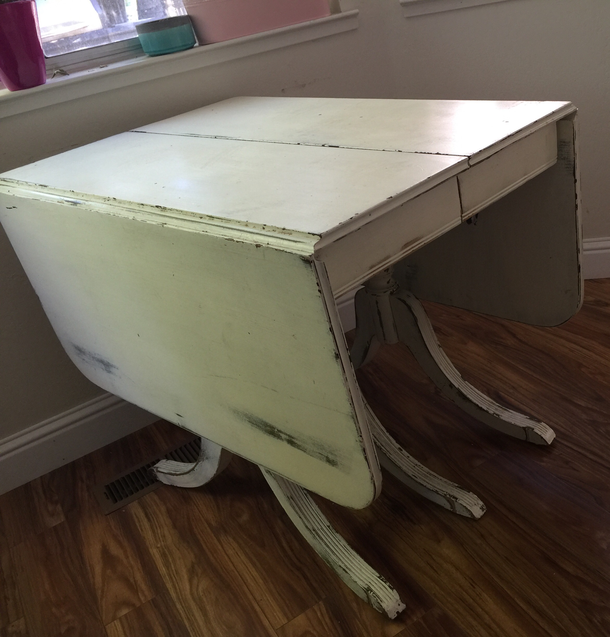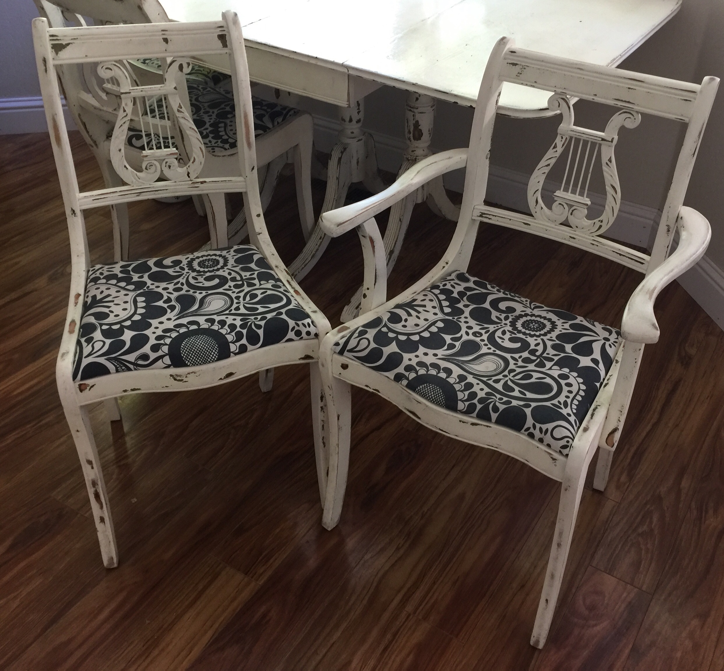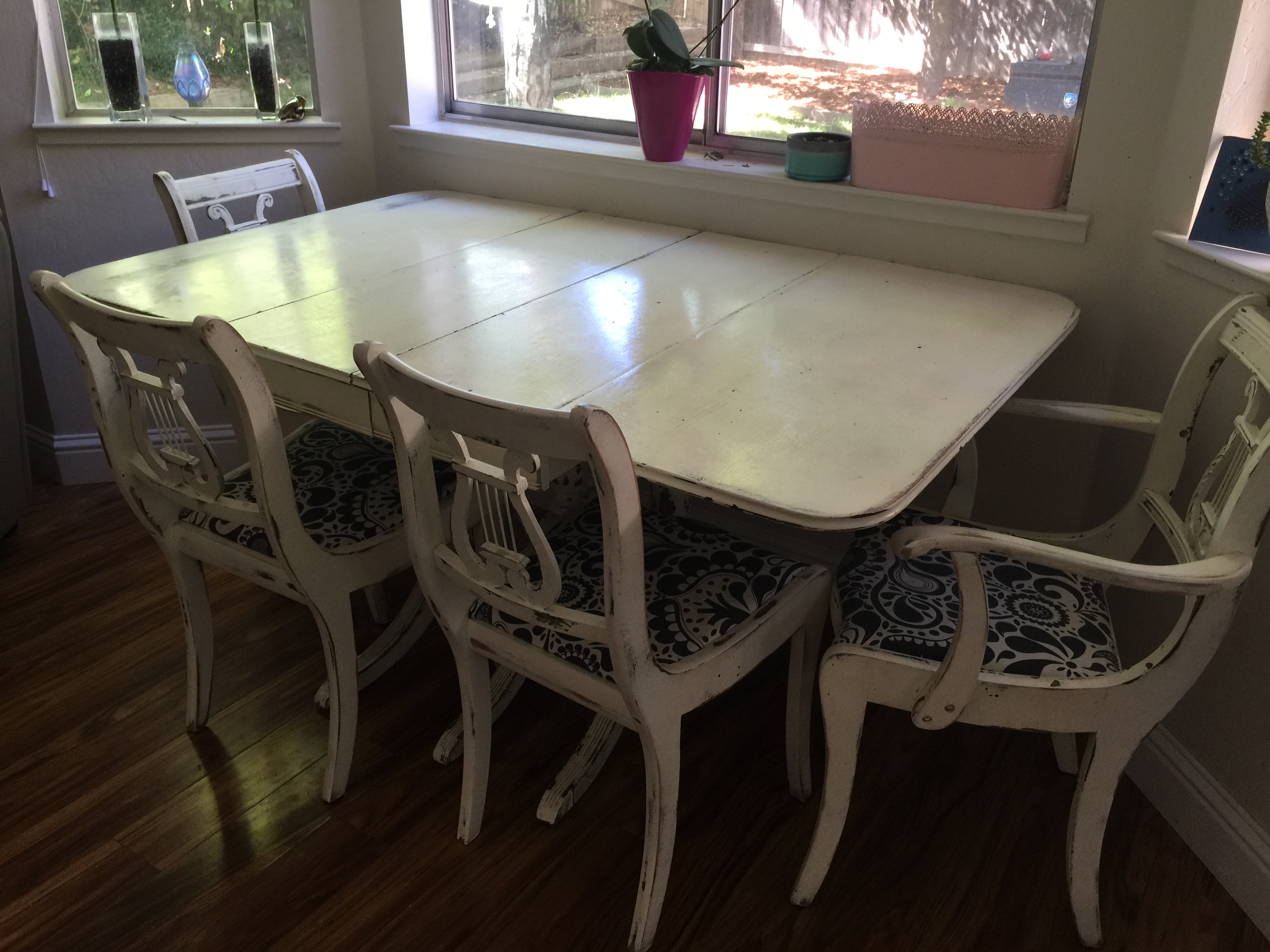 I purchased this dining room table and chairs from a "shabby chic" boutique in Reno, Nv in 2004.  The table drops down on both sides and allows for an extension, which was not available for purchase.  There is one captain's chair and five regular chairs, all of which were reupholstered before purchasing  There is a manufacture ticket (?) located under one chair, a letter I or very wide H branded underneath on the slide.
