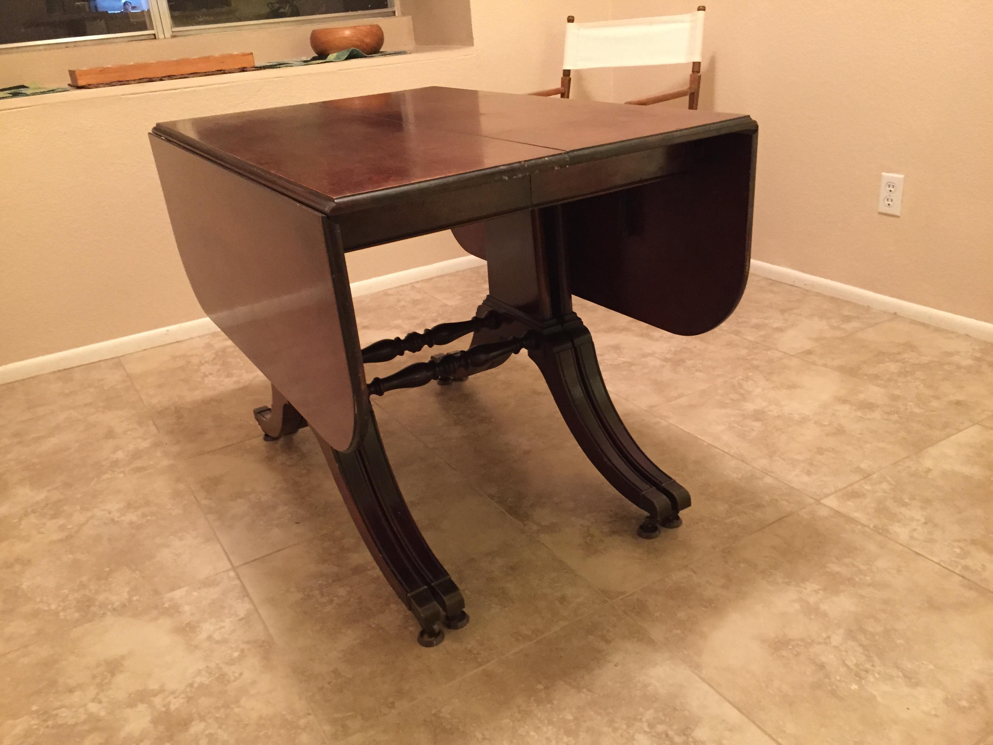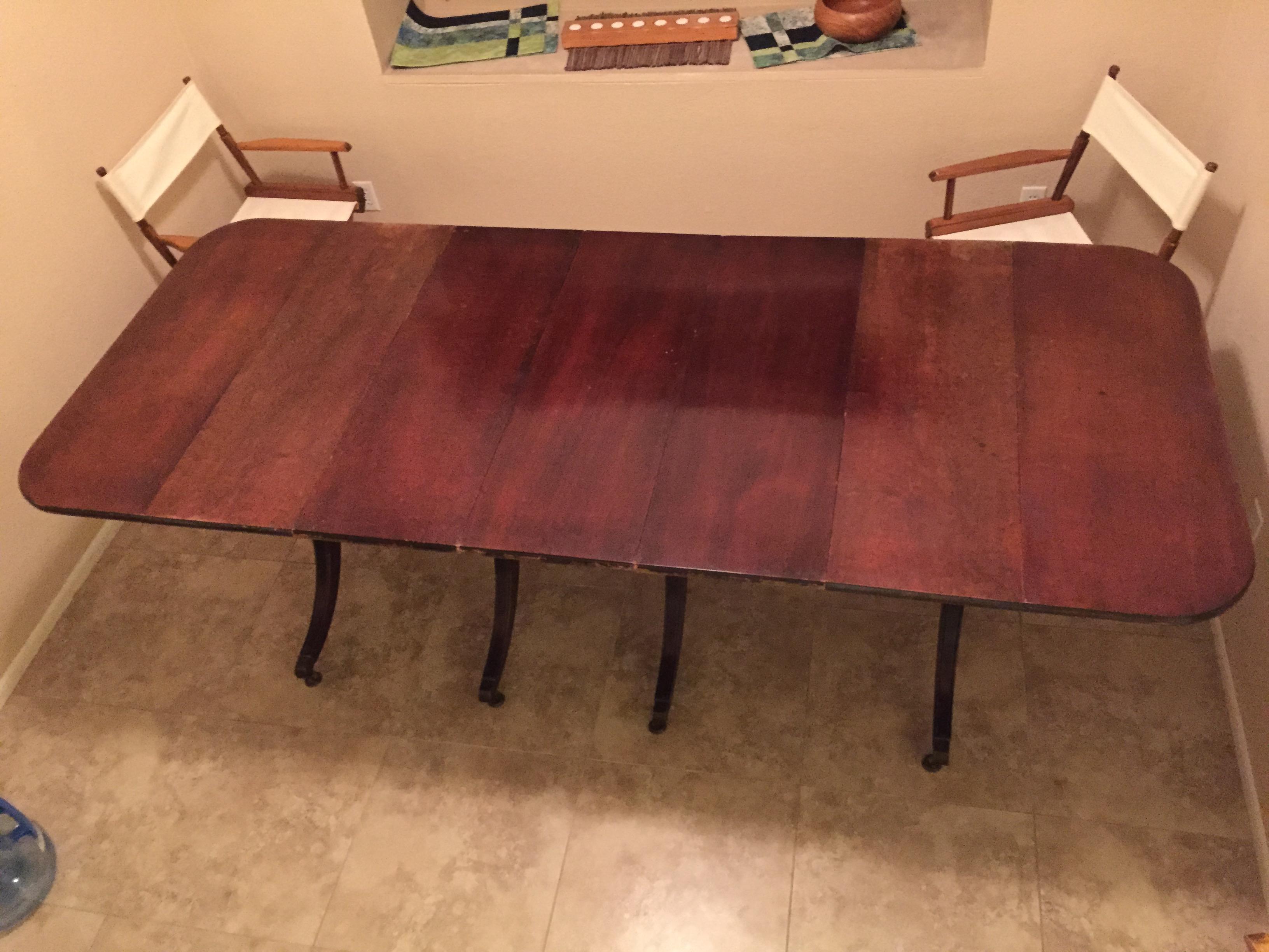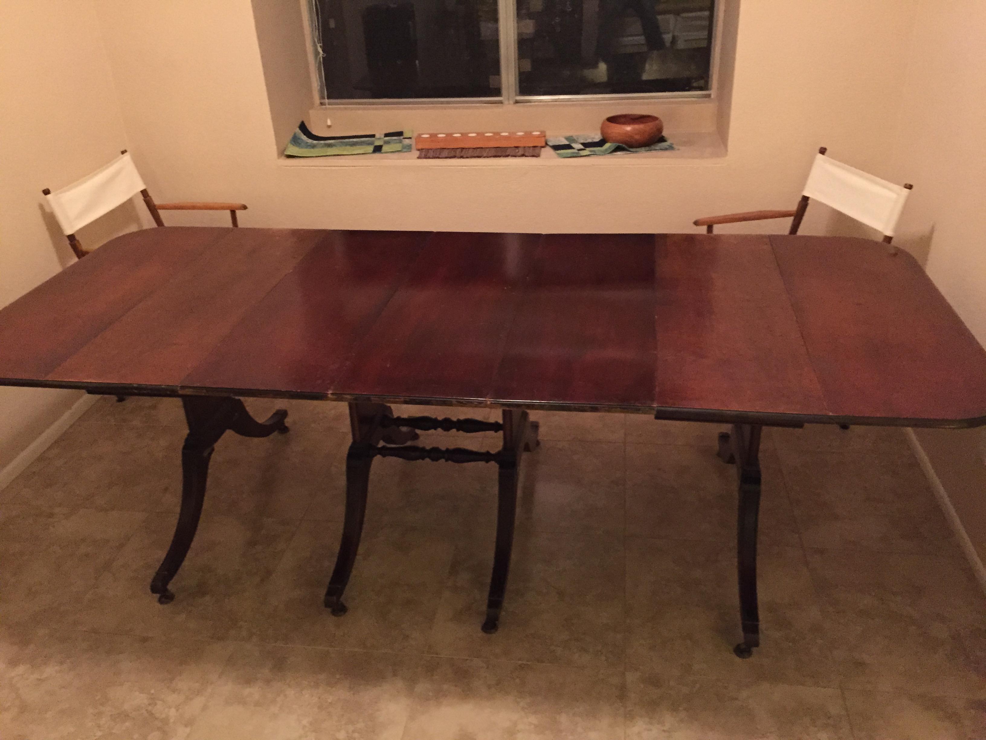 Brandt dining room table. From my grandmother and bought somtime in the 1920's. Has 3 leafs to add in. Table needs to be refinished with wear and tear from use.