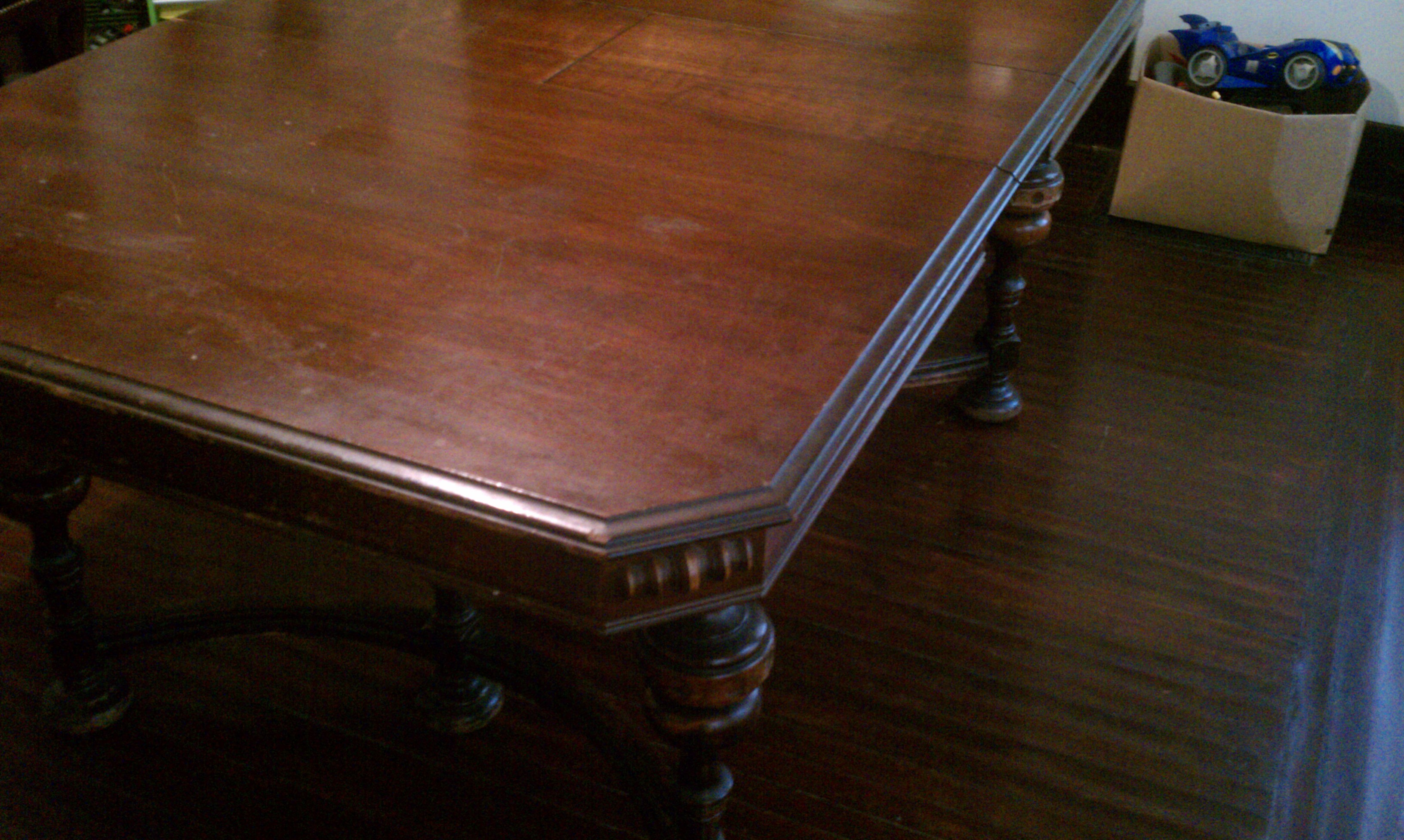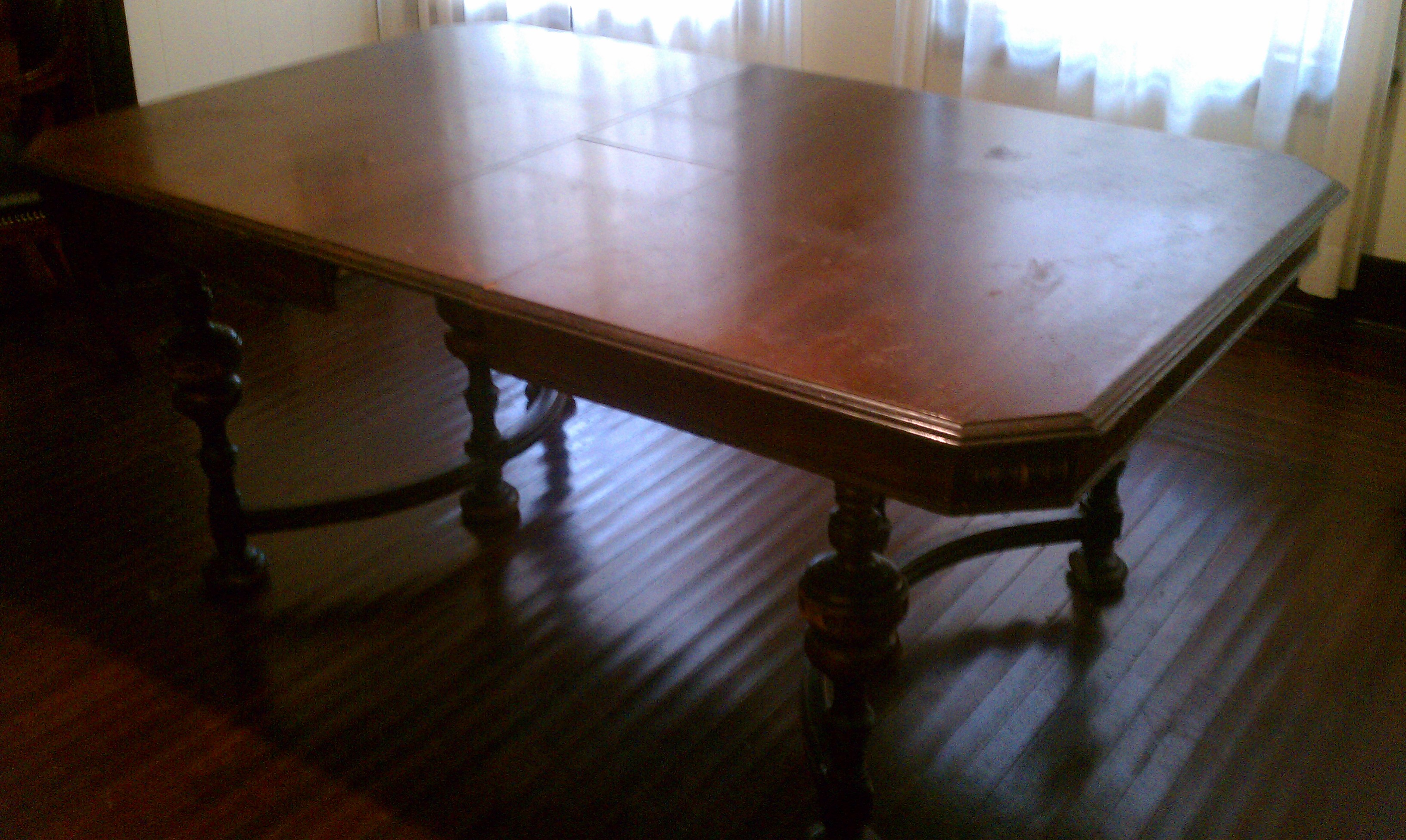 found it at a yard sale, table has piece in the middle that collapses when you pull lever at the head seating place, The table has decrotive carving around the edge of the table (not on tap, but side), also the legs of table and chairs are also well detailed. The chairs have material on the seating part of the chair ( yellowish-gold in color). The tag found stapled to the under-side of the table sates that it was manufactured by the Tindall-Wagner Manufacturing Company in Shelbyville, Indiana and sold at the Royal Furniture Company in Cleveland, Ohio